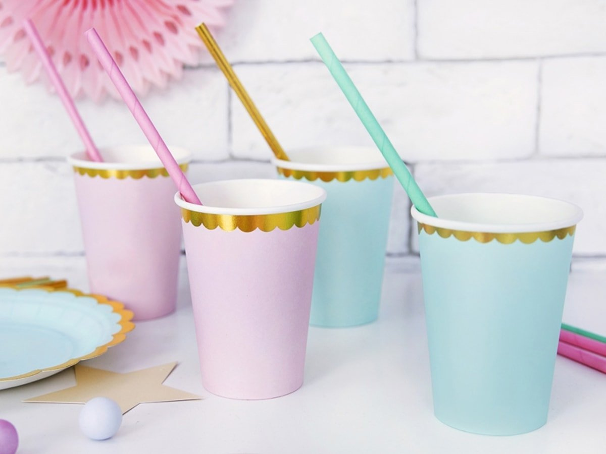Te urocze kubeczki papierowe w delikatnym odcieniu jasnoróżowym z piękną złotą obwódką dodadzą blasku i elegancji Twojej imprezie. Idealnie nadają się na różnorodne okazje, takie jak urodziny, baby shower, czy inne przyjęcia i celebracje.