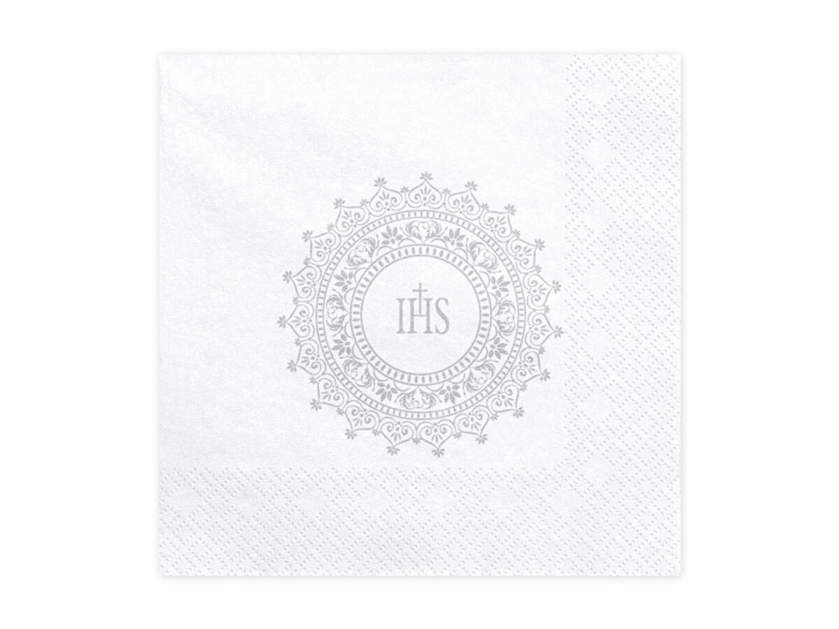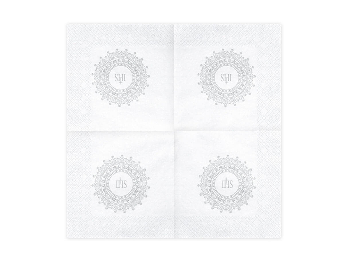 Serwetki komunijne ze srebrnym IHS - białe - 33x33 - 20 szt