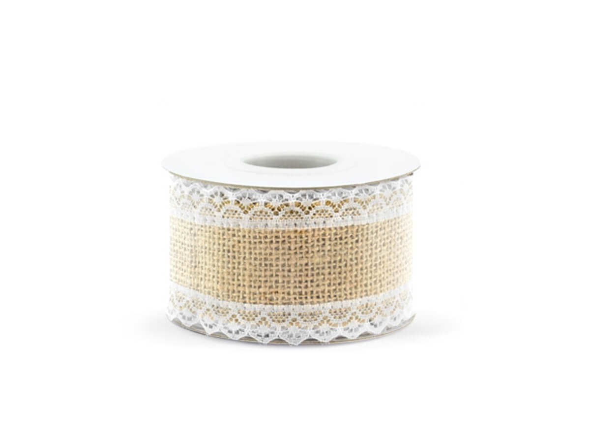 Tasiemka jutowa z białą koronką, 50 mm / 5 m, 1 szt.