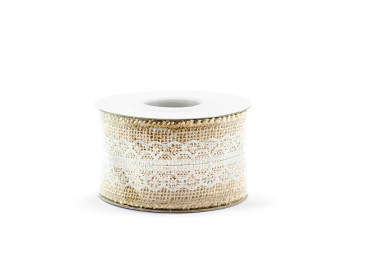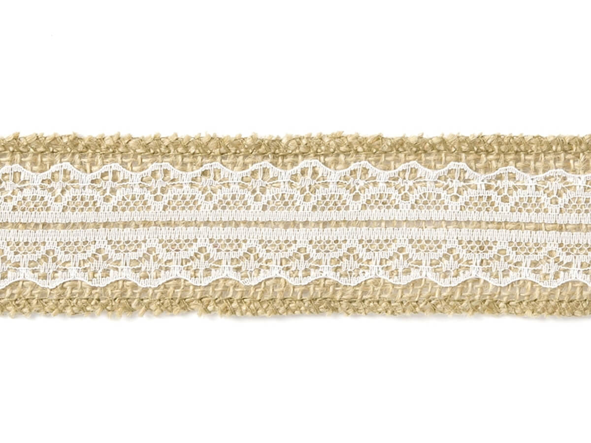 Tasiemka jutowa z białą koronką, 50 mm / 5 m, 1 szt.