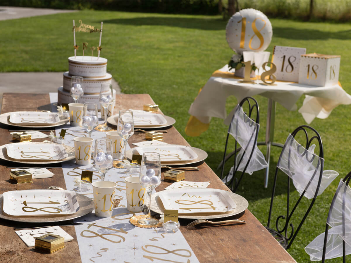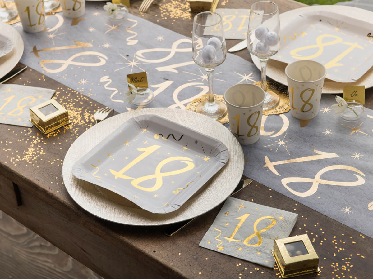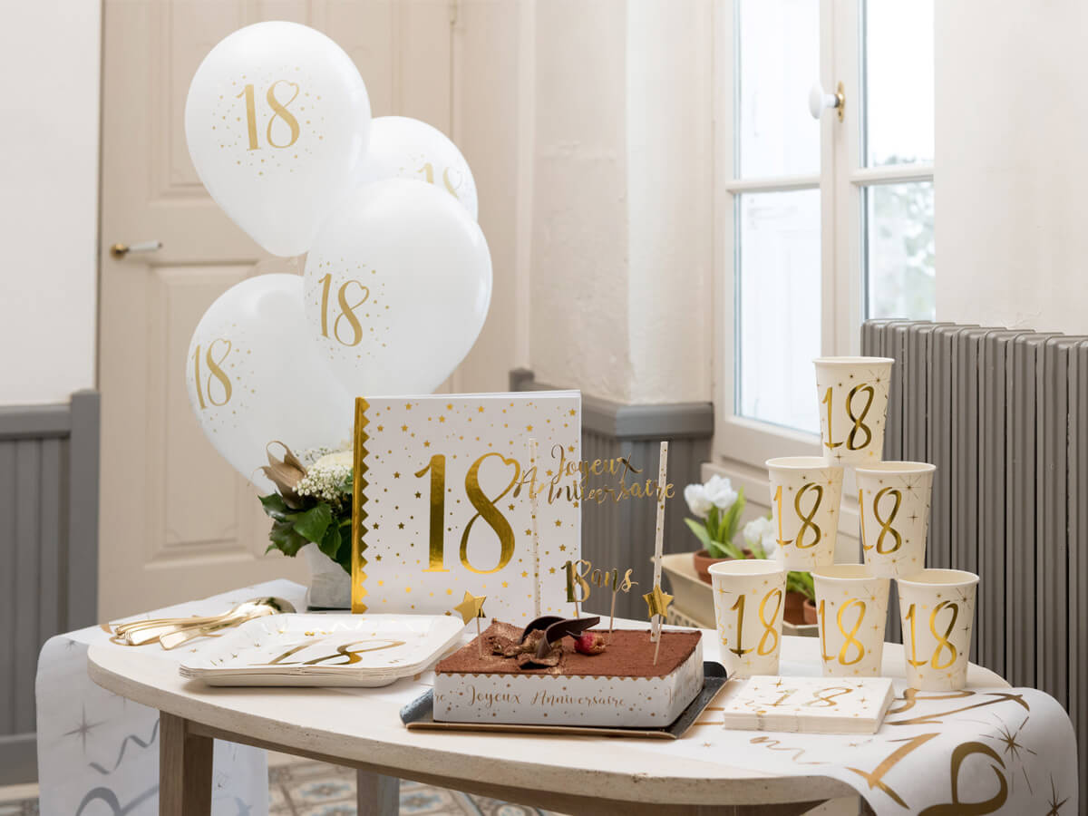 Złoty nadruk "18" na białym tle jest zarówno elegancki, jak i nowoczesny, a jednocześnie wyraźnie komunikuje, że to jest wyjątkowa okazja.