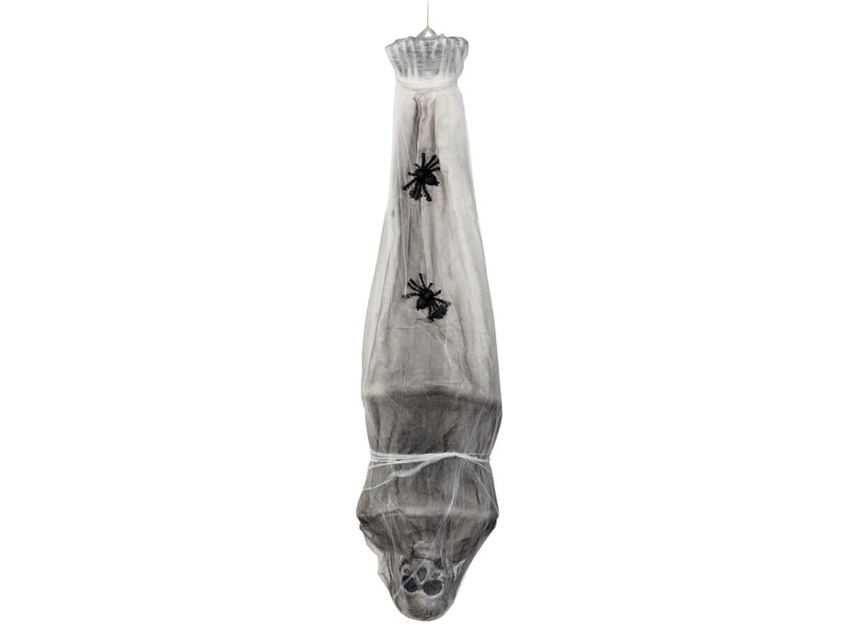 Szkielet jest starannie owinięty w pajęczynę, co dodaje mu autentycznego, strasznego wyglądu.