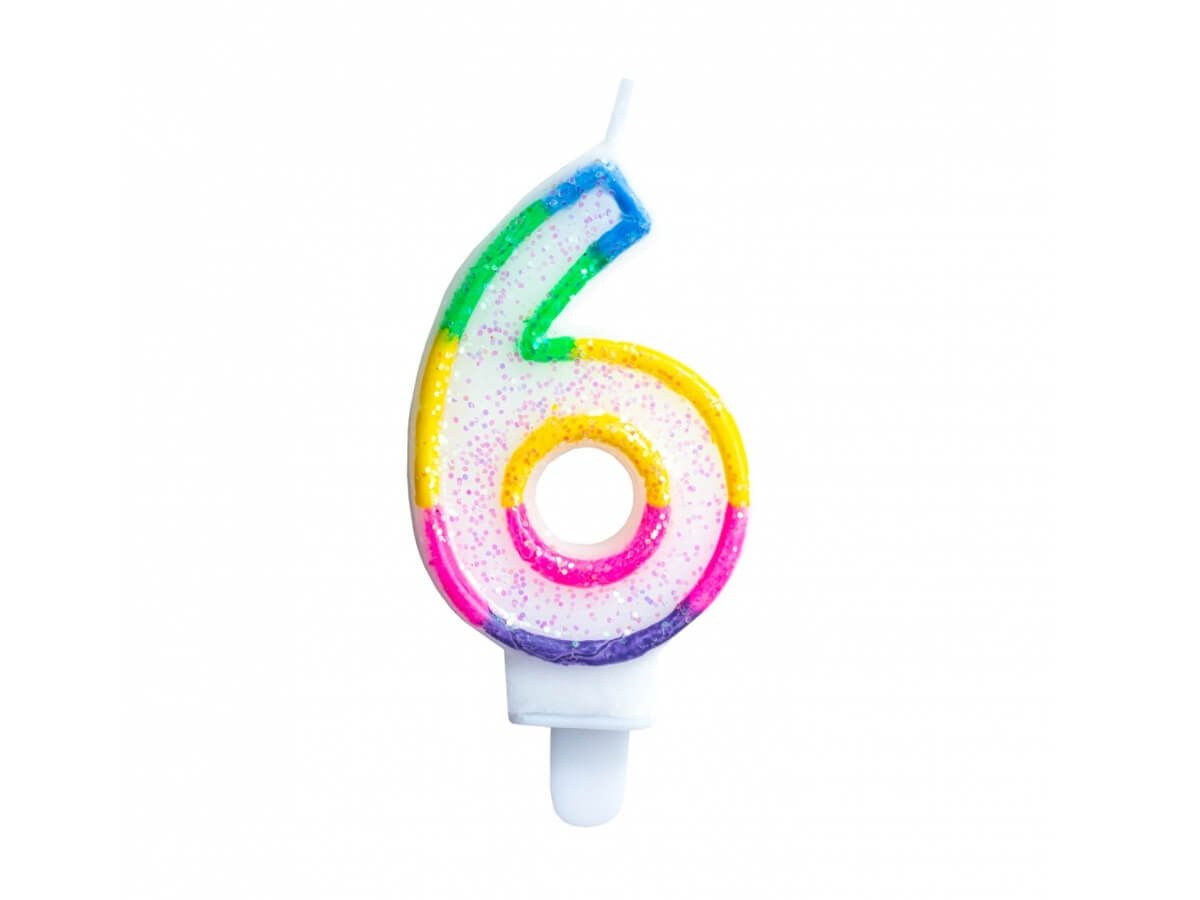 Świeczka cyferka brokatowa z tęczową obwódką 6 - 1 szt.
