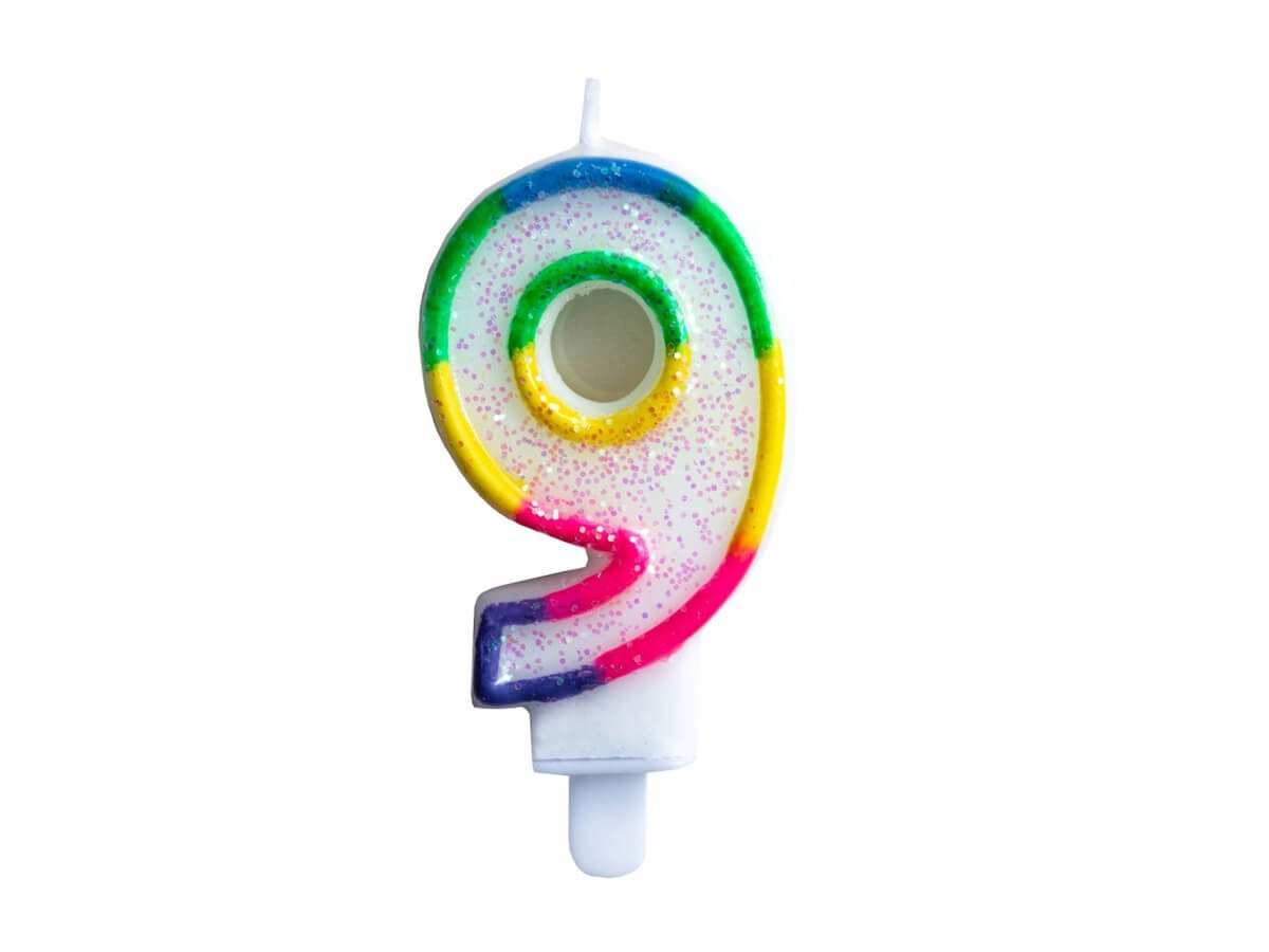 Świeczka cyferka brokatowa z tęczową obwódką 9 - 1 szt.
