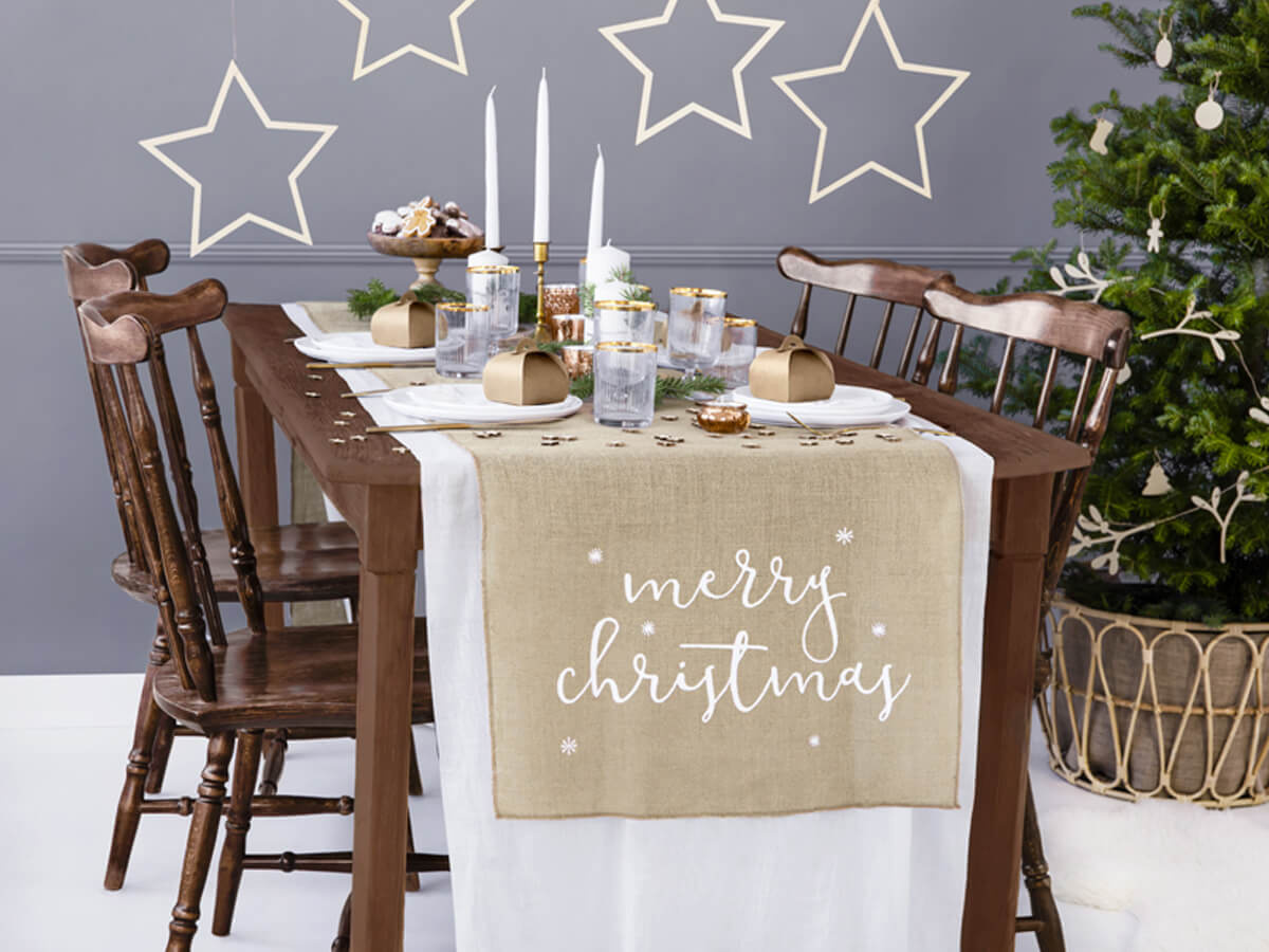 Dekoracja bieżnik na stół jutowy Merry Christmas - 2,5 m - 1 szt.