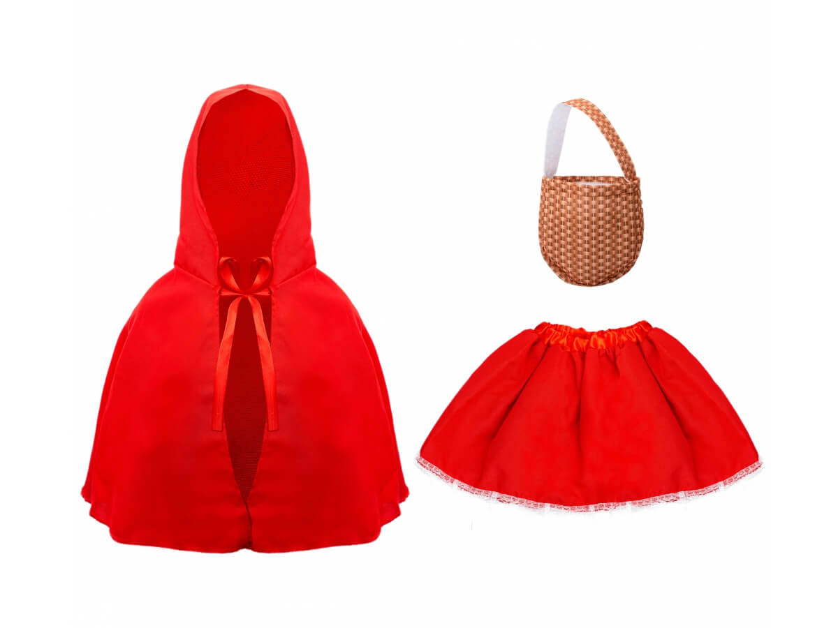 W skład zestawu wchodzi elegancka czerwona peleryna z kapturem, która zapewni każdej dziewczynce wygląd prawdziwej Czerwonego Kapturka. Dodatkowo, stylowa spódnica i urocza torebka imitująca koszyk doskonale dopełniają strój, czyniąc go pełnym i przemyślanym wyborem na każdą zabawową okoliczność.