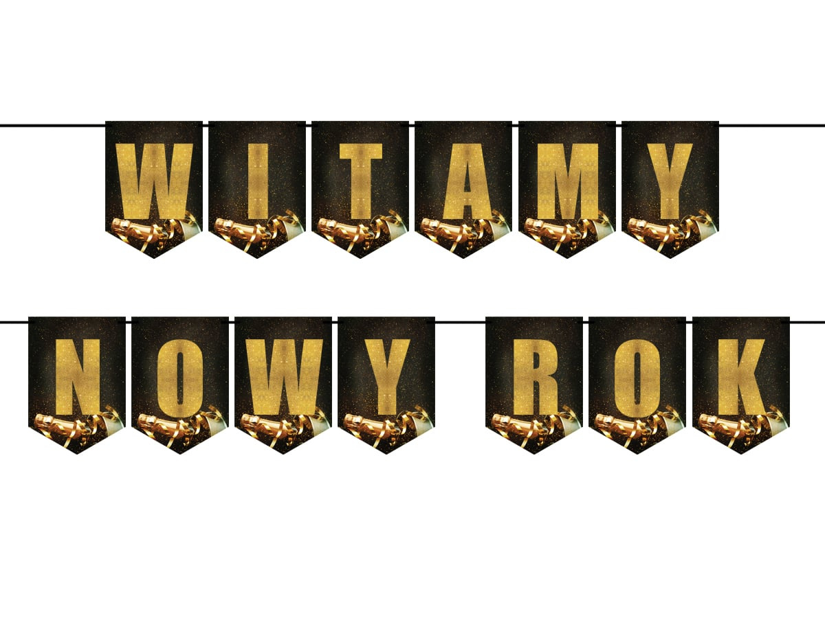 Przedstawiamy wyjątkową dekorację, która doda blasku każdemu Sylwestrowi i powitaniu Nowego Roku - Duża girlanda baner flagi Witamy Nowy Rok. Skomponowana z 13 flag, każda o wymiarach 29x41 cm, girlanda tworzy imponującą dekorację. Została wykonana z wysokiej jakości papieru, co gwarantuje trwałość i solidność. Każda flaga zdobiona jest stylowym nadrukiem z motywem Nowego Roku, który wprowadzi magiczną atmosferę podczas najważniejszej nocy w roku.
