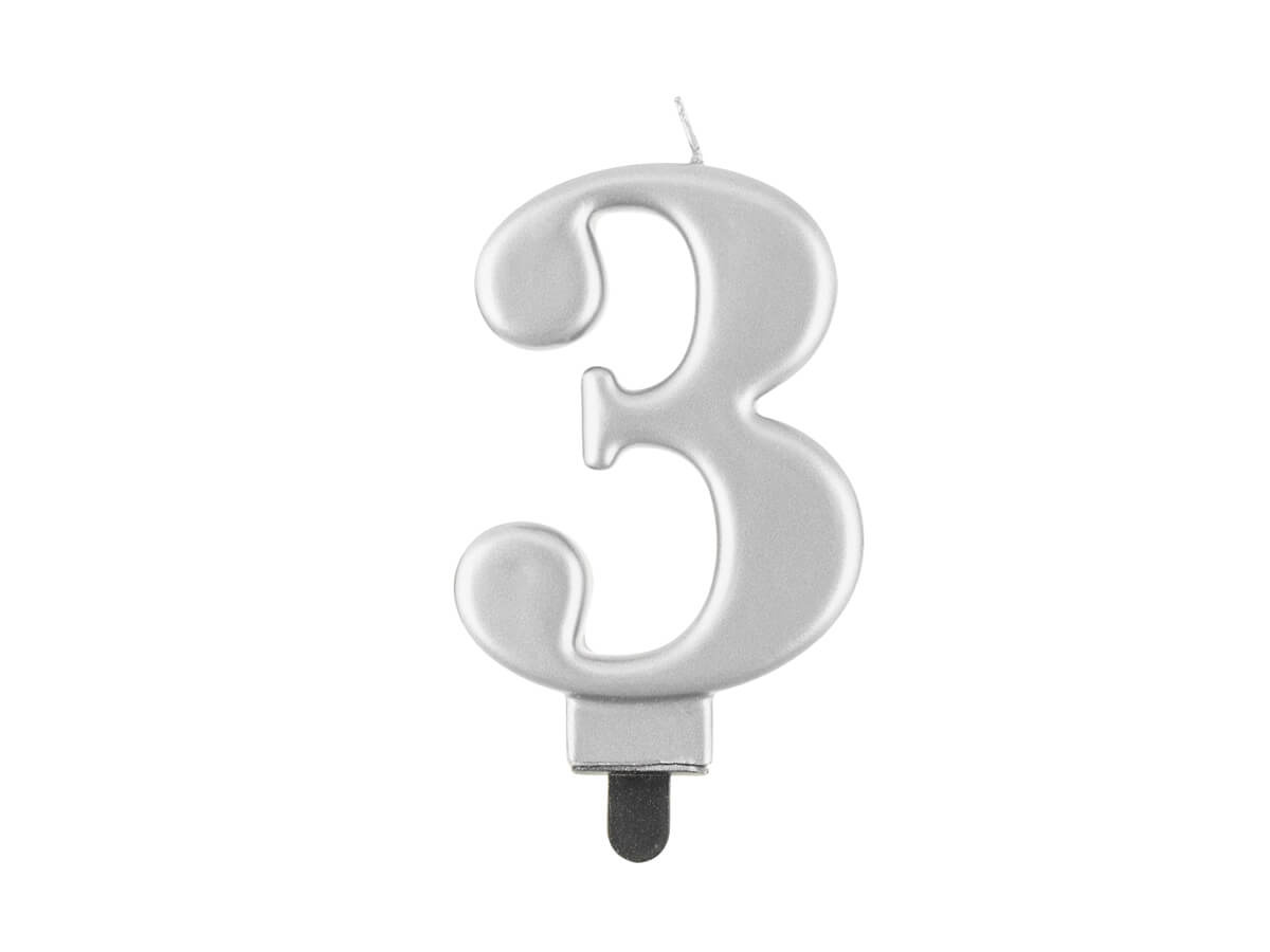 Świeczka cyferka metaliczna srebrna - 3 - trzy