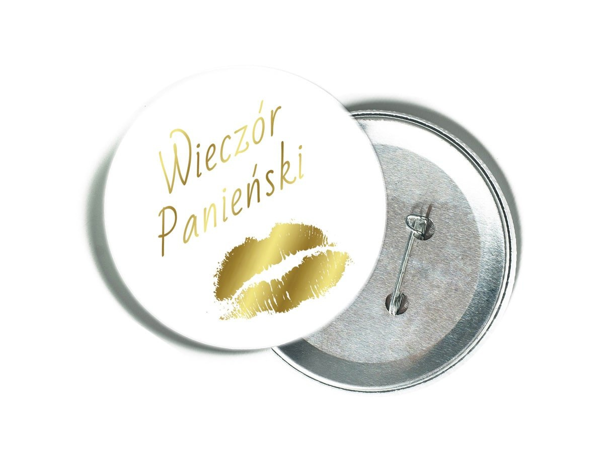 Przypinka biała ze złotym napisem i ustami na Wieczór Panieński