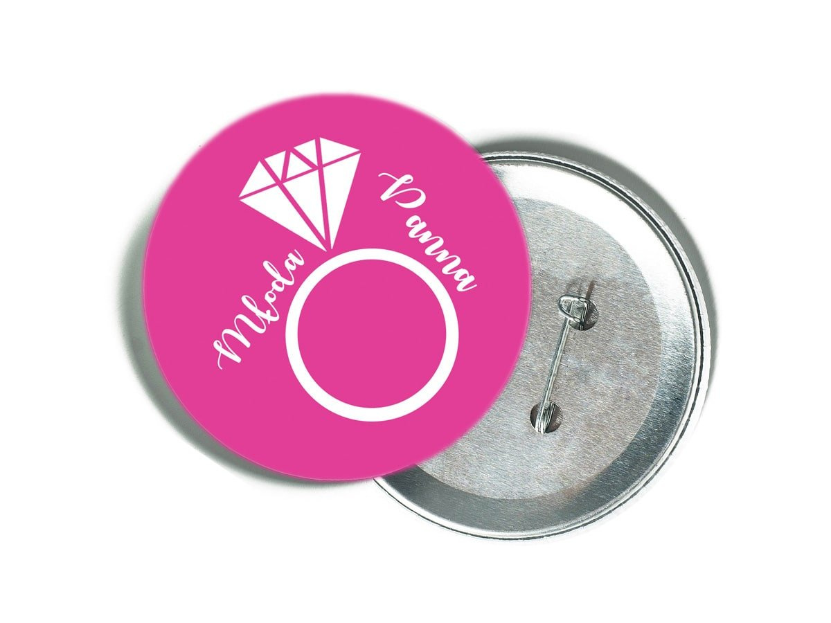 Przypinka różowa z białym napisem Panna Młoda i pierścionkiem