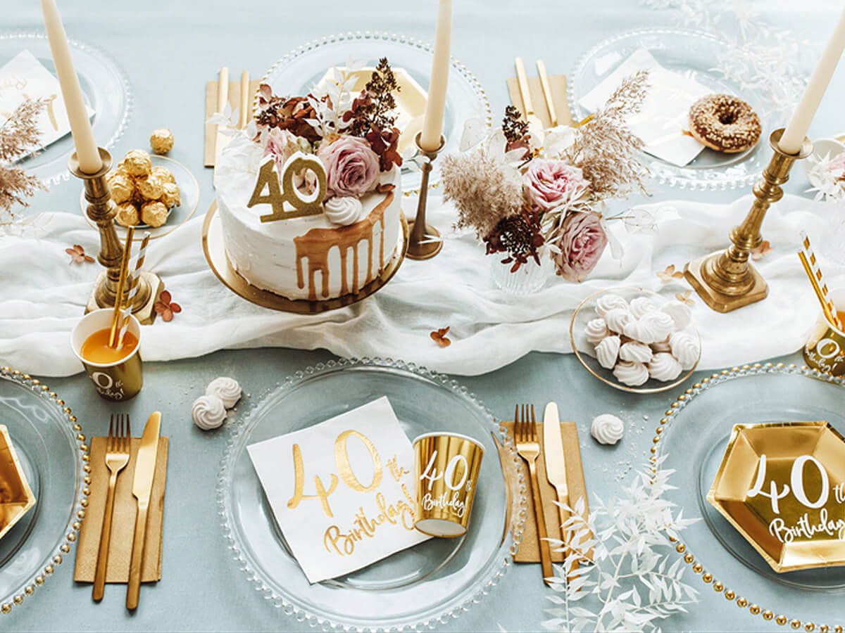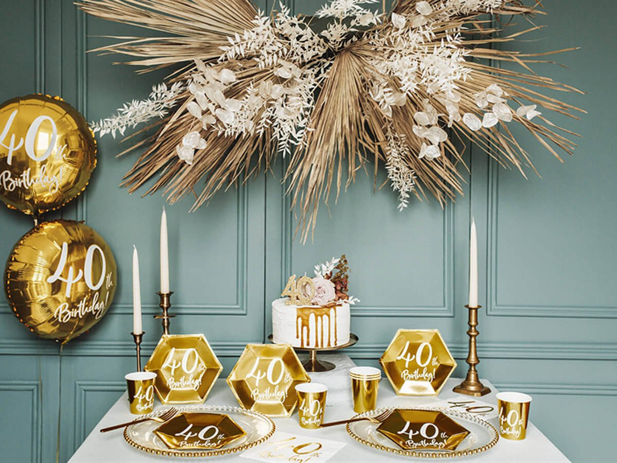 Złoty kolor dodaje elegancji, a biały nadruk "40th Birthday!" podkreśla wyjątkowość tego dnia.
