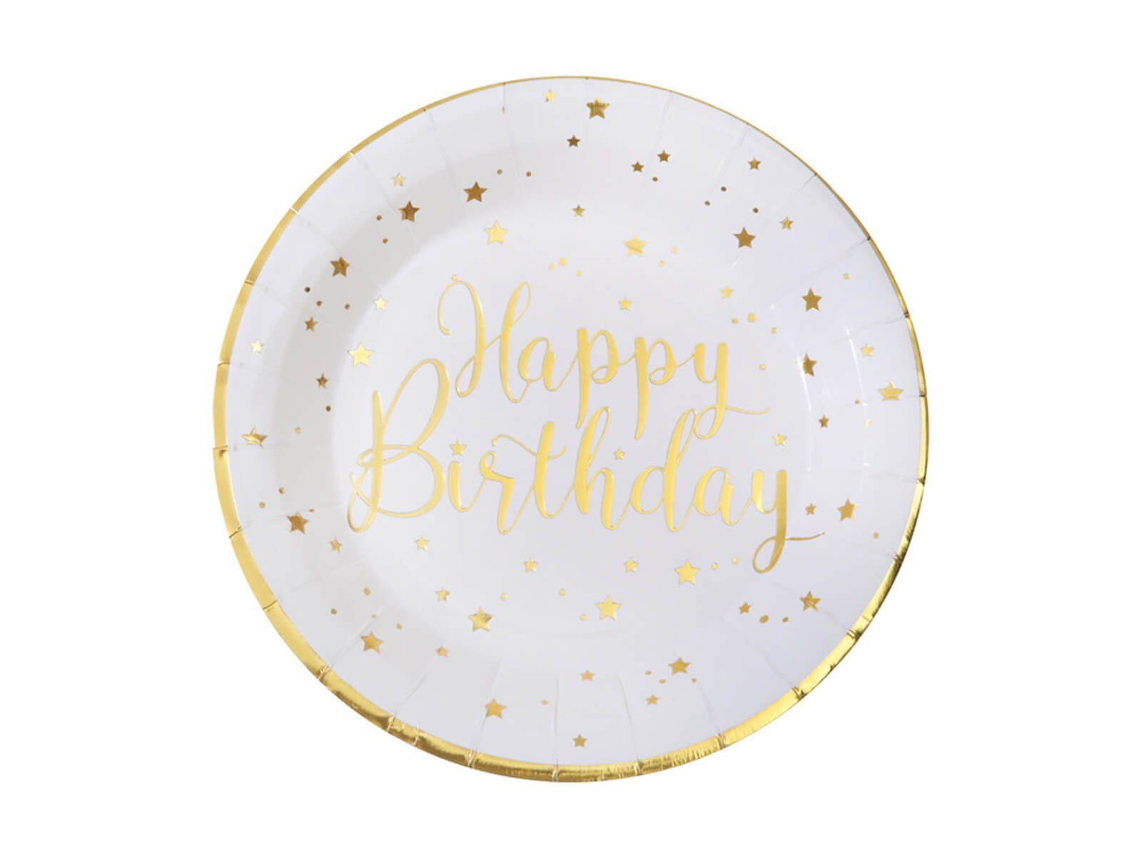 Zapraszamy do odkrycia naszych wyjątkowych Talerzyków Urodzinowych Happy Birthday. Te papierowe talerzyki w kolorze białym, ozdobione złotym metalizowanym napisem Happy Birthday oraz nadrukiem złotych gwiazdek, to idealny dodatek do każdej urodzinowej imprezy.