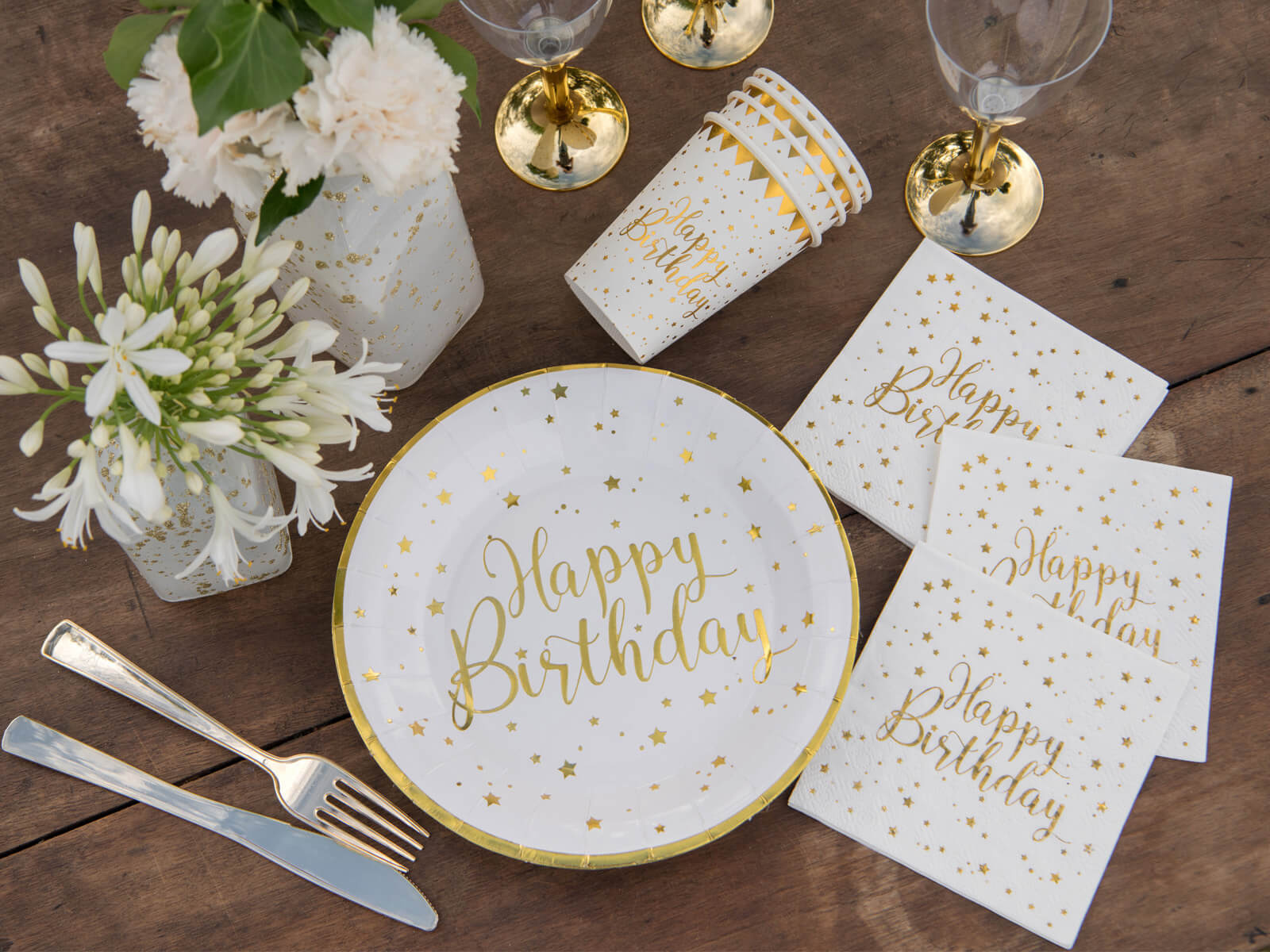Zapraszamy do odkrycia naszych Kubeczków Urodzinowych Happy Birthday - idealnych na każdą imprezę! Wykonane z wysokiej jakości materiałów, te białe kubeczki ozdobione są złotym, metalizowanym napisem "Happy Birthday", dodającym elegancji i wyjątkowego charakteru. Każde opakowanie zawiera 10 sztuk o pojemności 250 ml - idealne do serwowania ulubionych napojów gości.