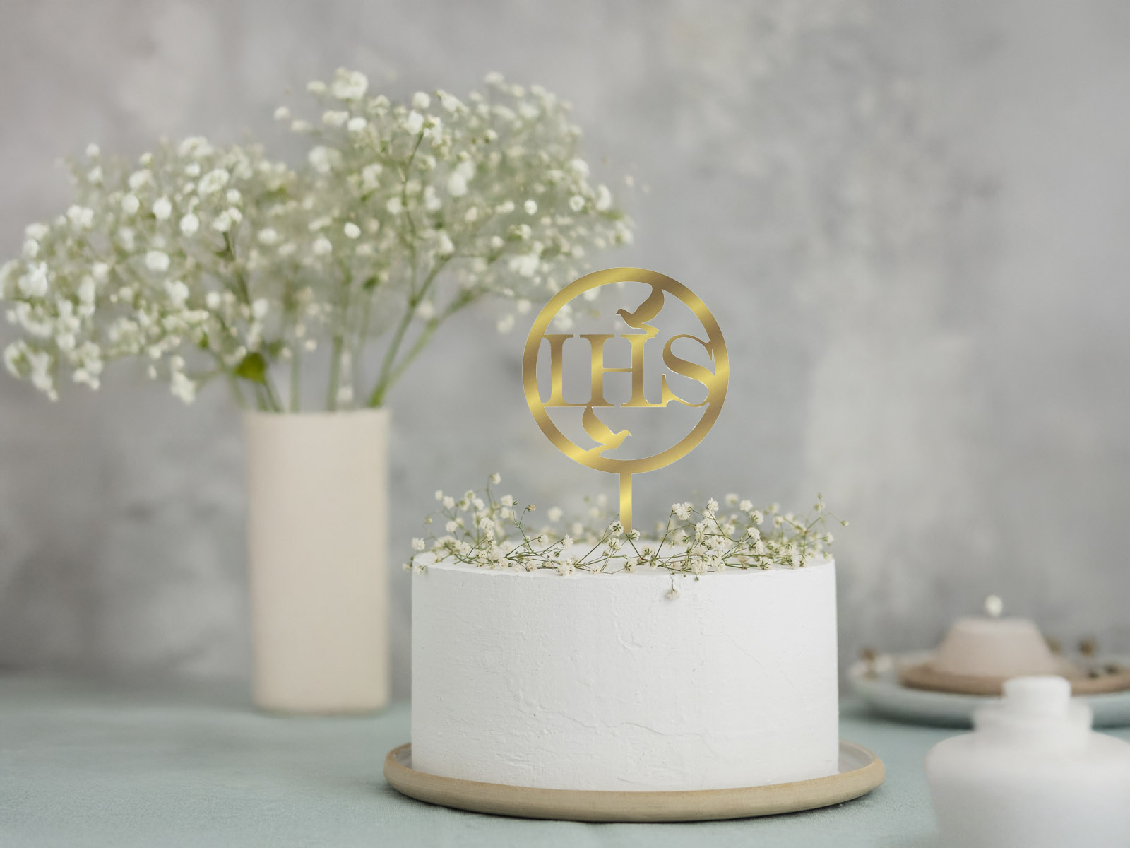 Topper z lustrzanej pleksi złoty na tort IHS I Komunia Święta