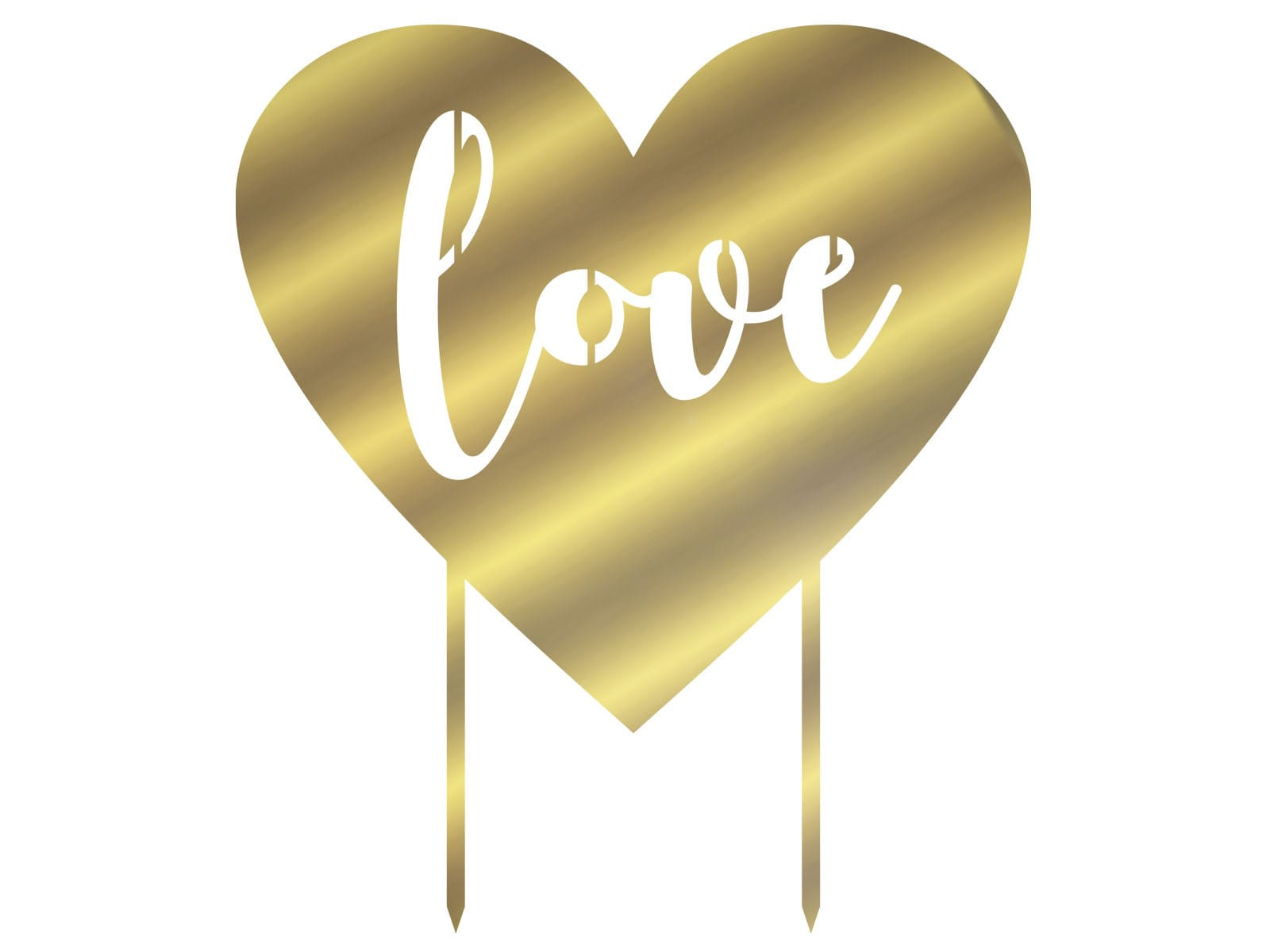 Duży topper z lustrzanej pleksi złoty serce z napisem love na tort - 18 cm