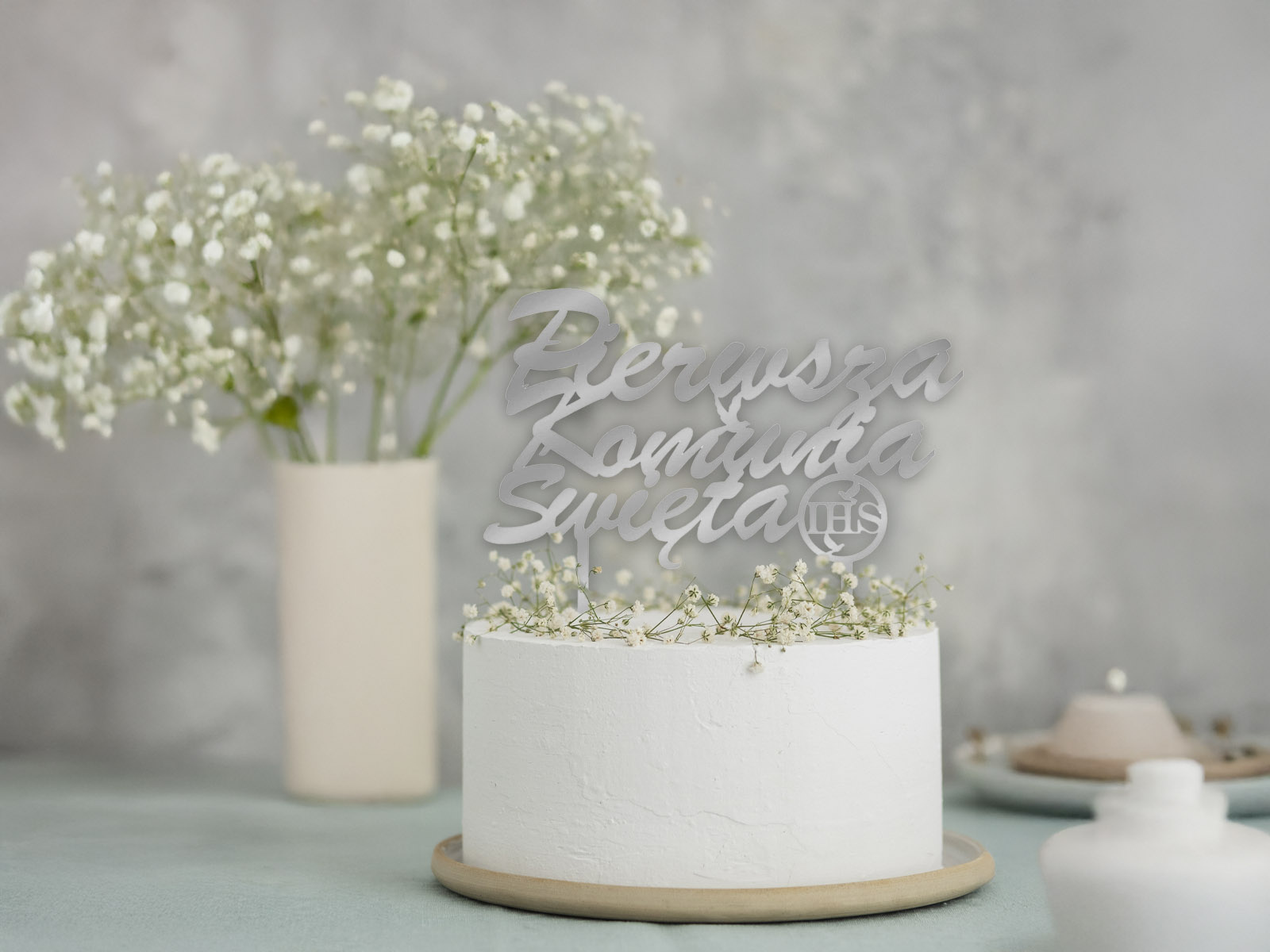 Topper z lustrzanej pleksi srebrny na tort Pierwsza Komunia Święta