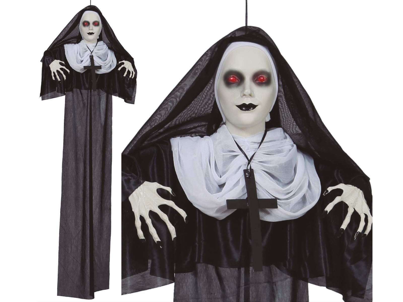Potrzebujesz niezapomnianej dekoracji na Halloween? Nasza Wisząca Dekoracja Zakonnica sprawi, że Twoje przyjęcie stanie się prawdziwie mroczne i niezapomniane. Realistyczne wykonanie oraz imponująca wielkość 120 cm z pewnością przyciągną uwagę gości i zaoferują niepowtarzalny klimat podczas Halloweenowych świąt.