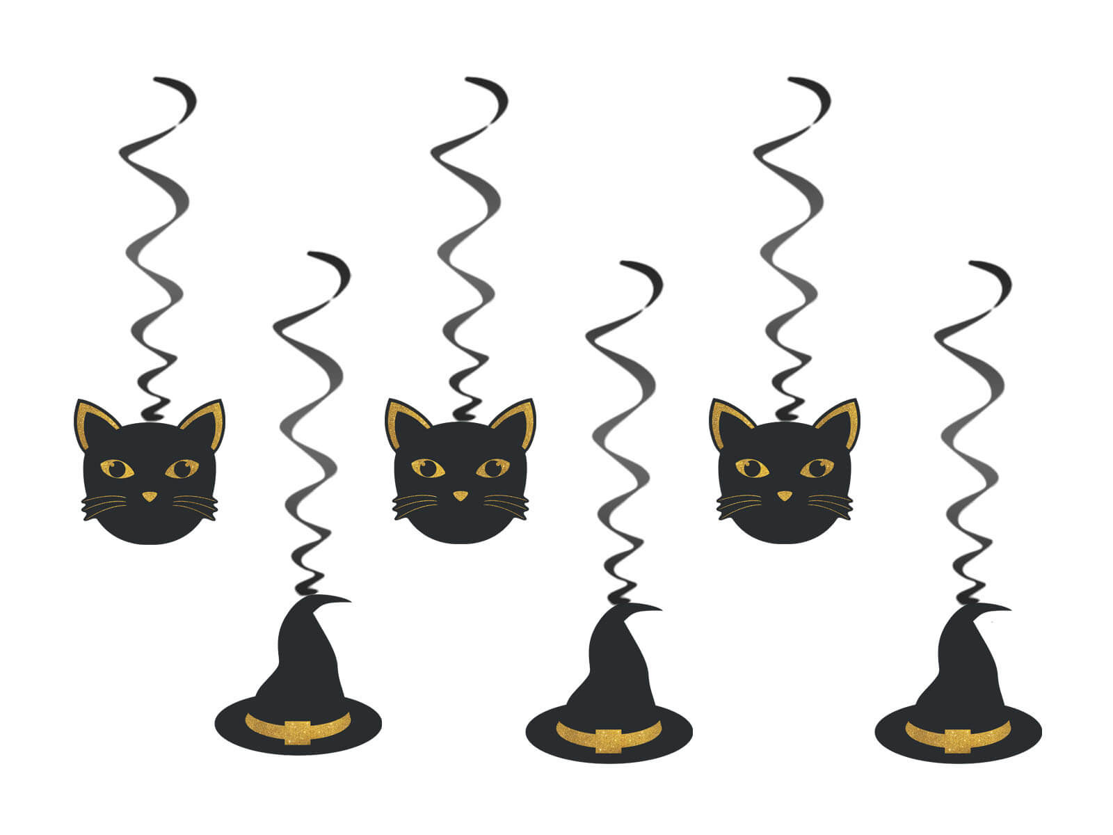 Zestaw zawiera 6 zawieszek z dekoracjami, które z łatwością można zawiesić na suficie, drzwiach, oknach czy też na ścianie. Wysokość dekoracji z kotem wynosi 10 cm, a kapelusz czarownicy - 11 cm. Długość zawieszki to około 65 cm, co pozwala na swobodne rozmieszczenie dekoracji w pomieszczeniu.