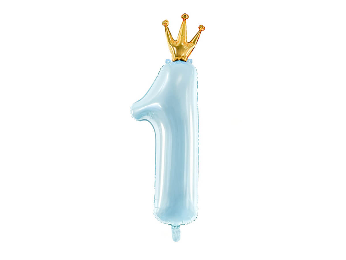 Balon foliowy cyfra 1 w koronie błękitny - 90 cm - 1 szt.