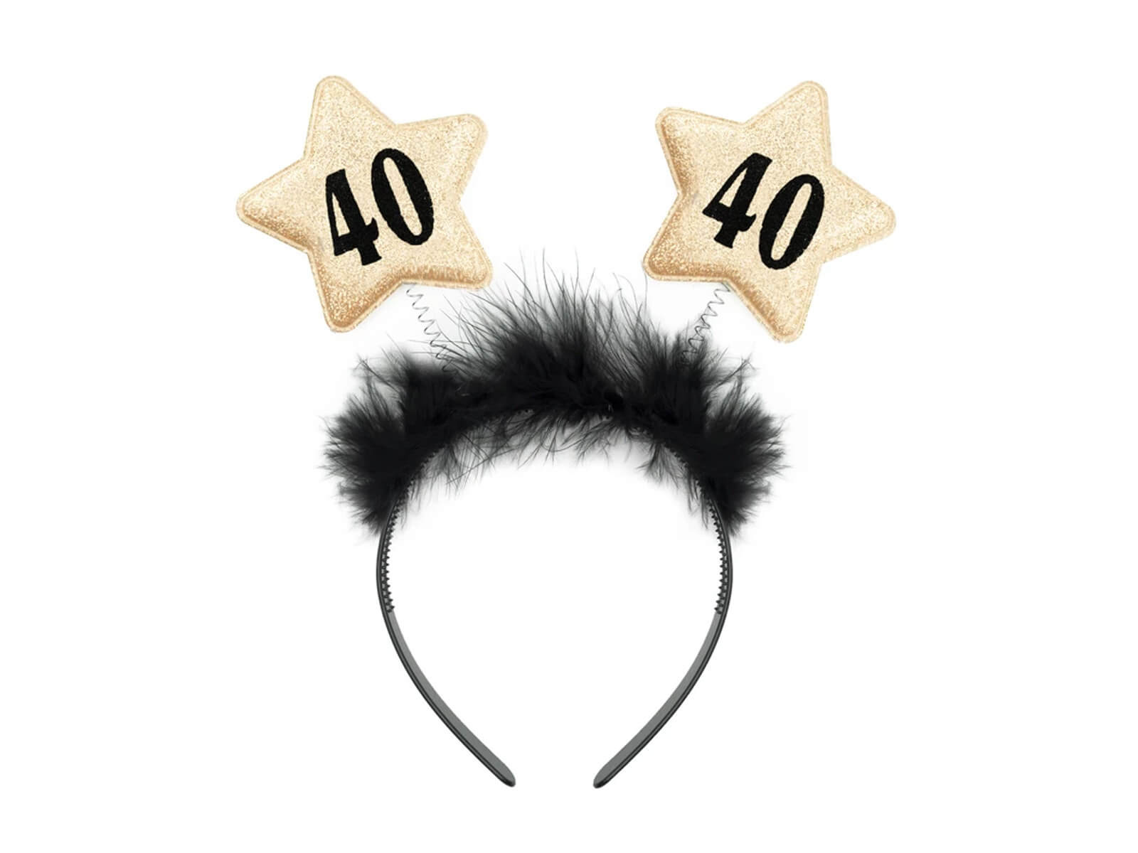 1. Wyjątkowy design - czarna, elegancka opaska wykonana z miękkiego futerka ozdobiona złotymi gwiazdkami z liczbą 40, która sprawi, że solenizant będzie gwiazdą wieczoru.