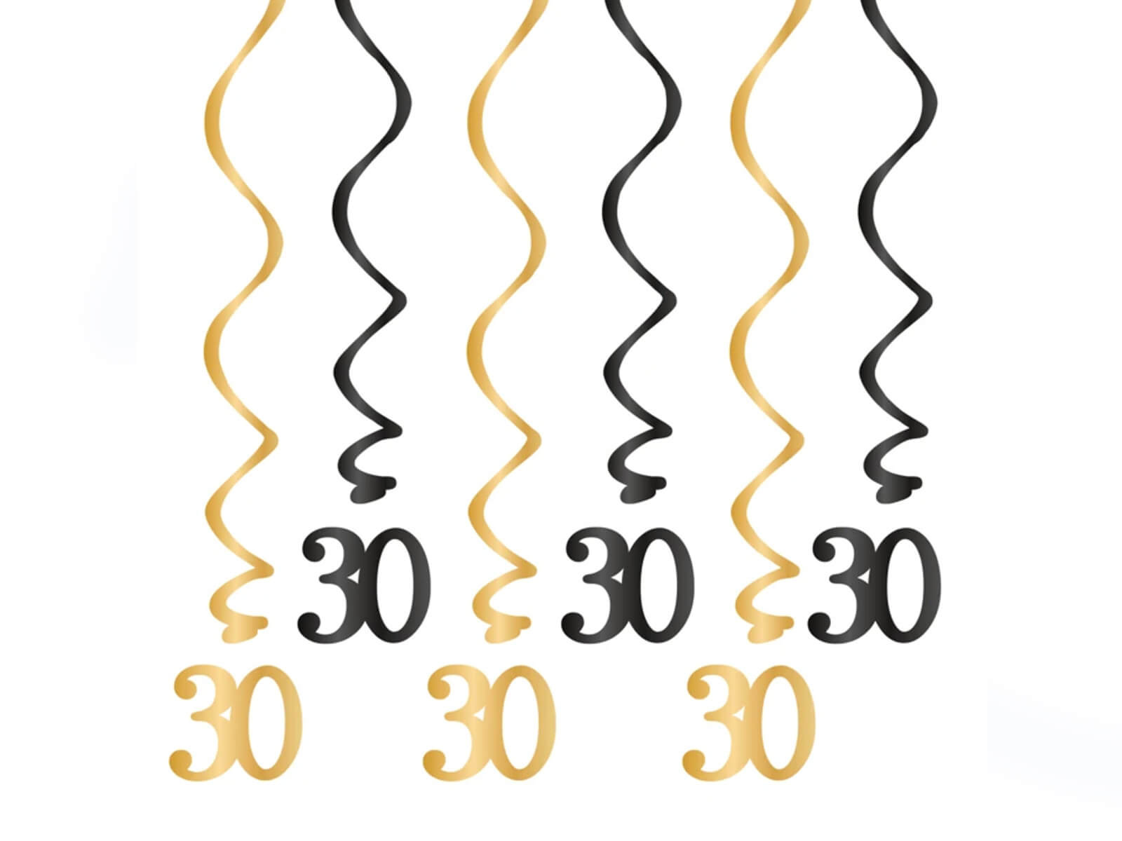Dekoracja wisząca świderki na 30-stkę złoto-czarne - 6 szt.