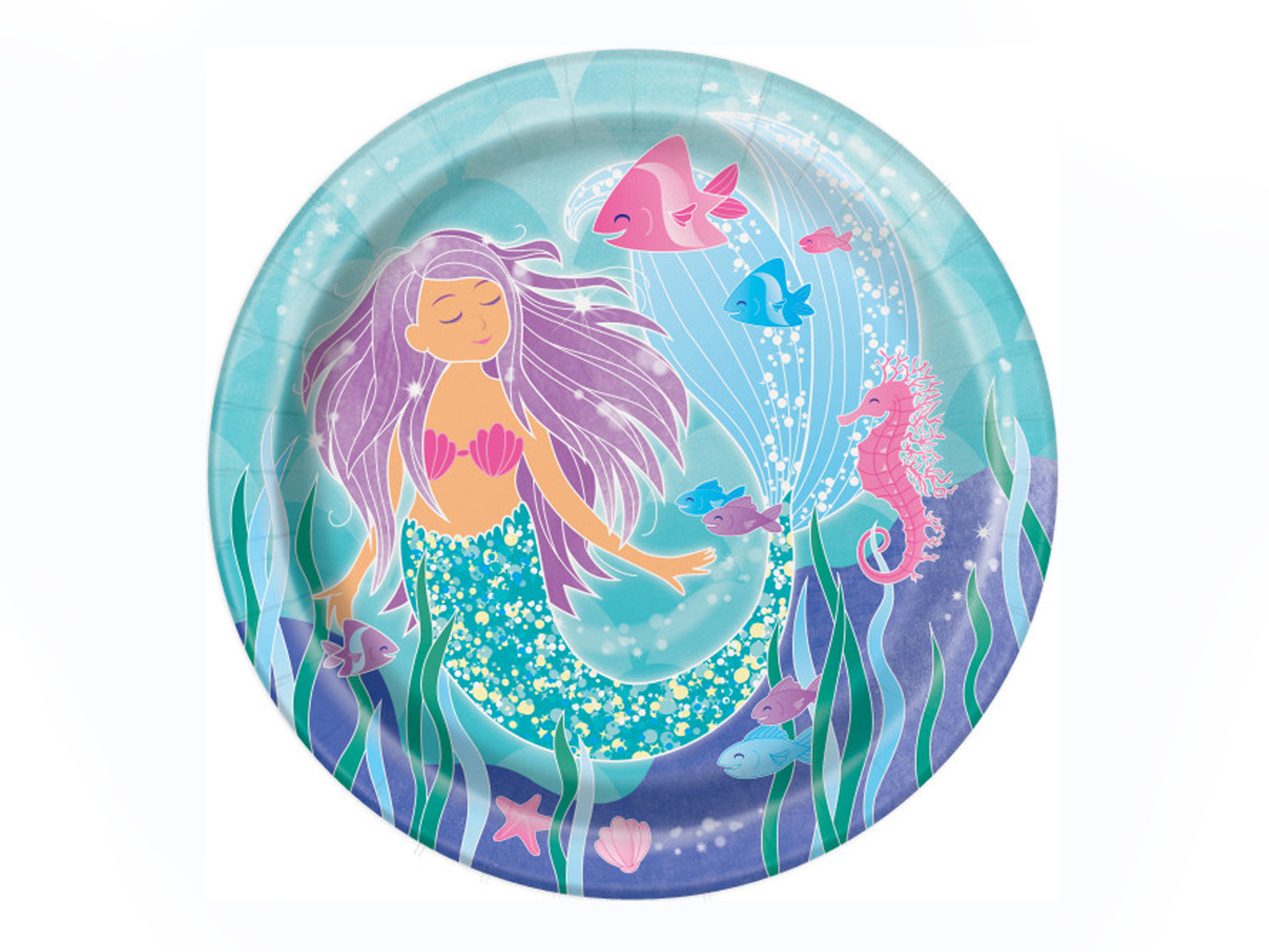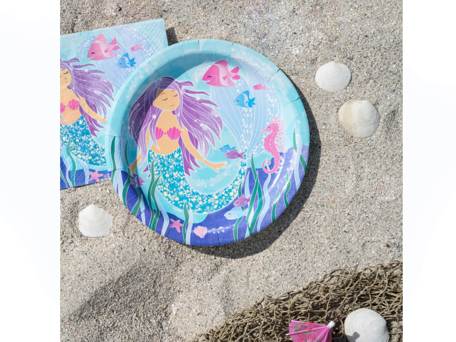 Pozwól swoim gościom zamienić się w prawdziwe syrenki, podczas gdy oni będą delektować się słodkimi smakołykami na swoich specjalnych i niepowtarzalnych talerzach. Te papierowe talerzyki o średnicy 23 cm mają kolorową kombinację oceanicznych odcieni, które ożywiają wyobraźnię! Opakowanie 8 sztuk gwarantuje, że każdy będzie miał wystarczająco dużo miejsca na wszystkie swoje smaczne przekąski.