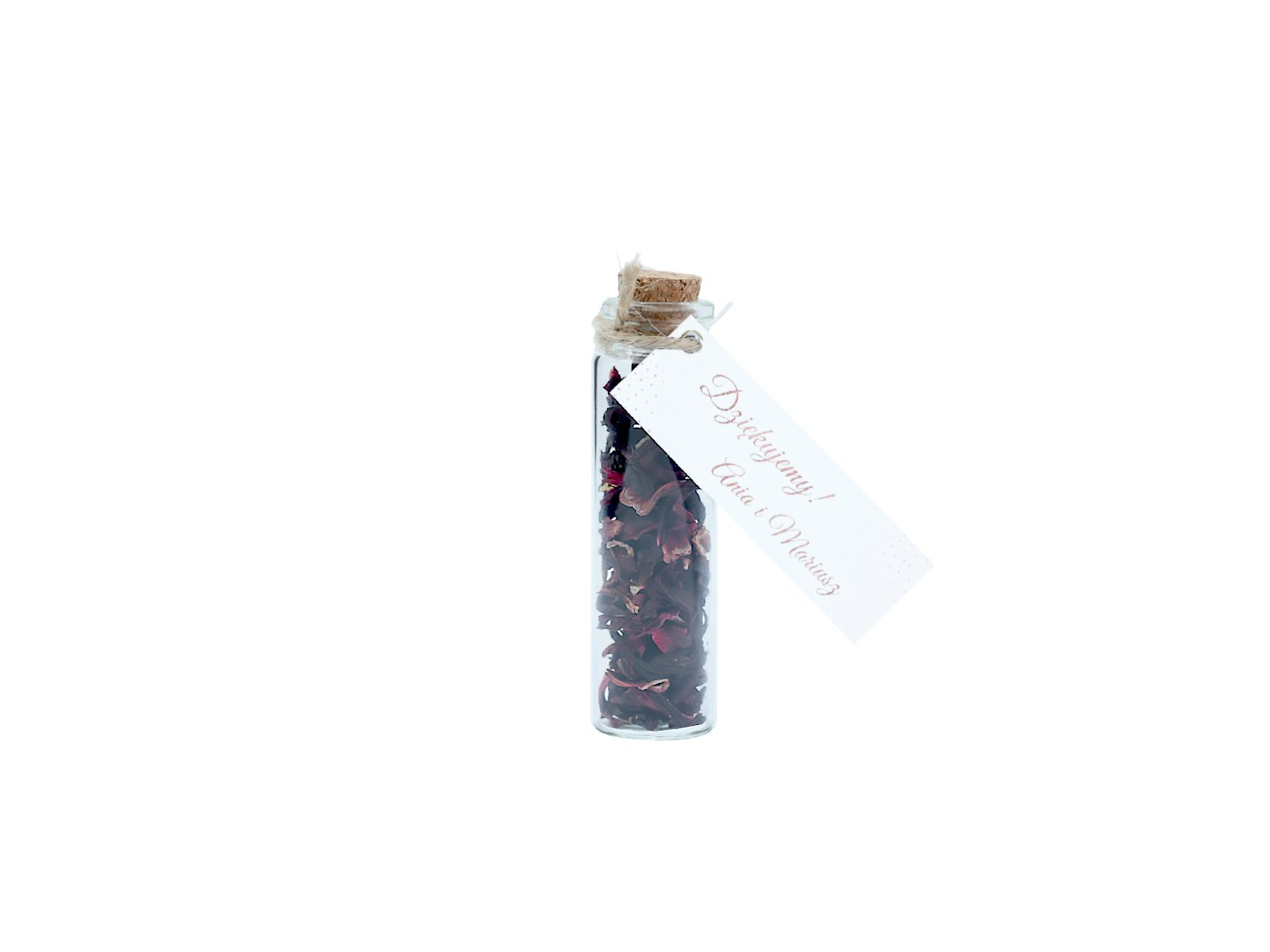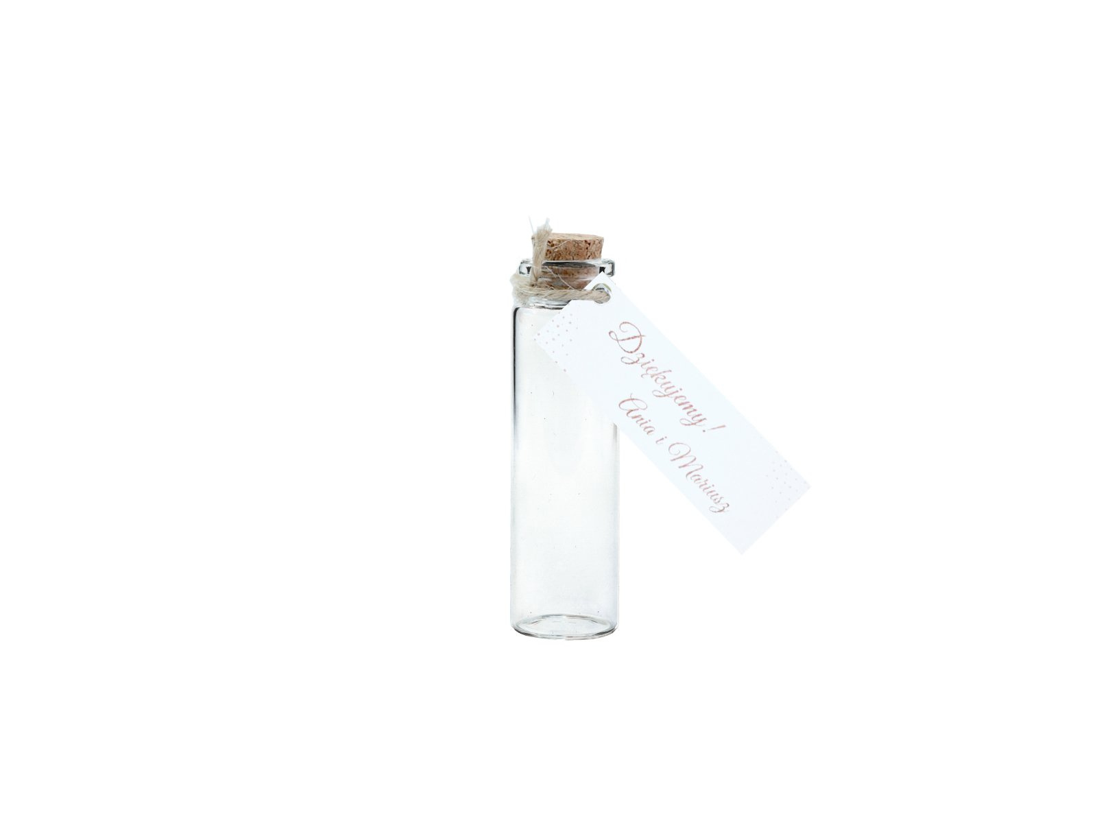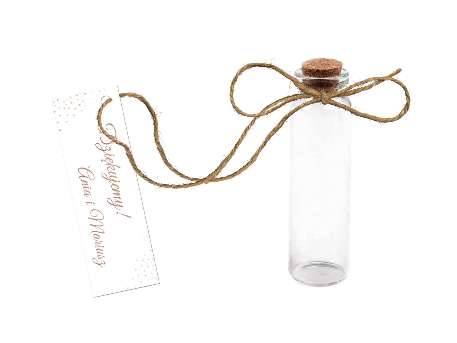 Szklane buteleczki z korkiem to świetny pomysł na podziękowania dla gości. W zestawie znajdują się personalizowane bileciki oraz sznurek jutowy. Do buteleczek można nasypać np. herbatę. Zestaw do samodzielnego związania.