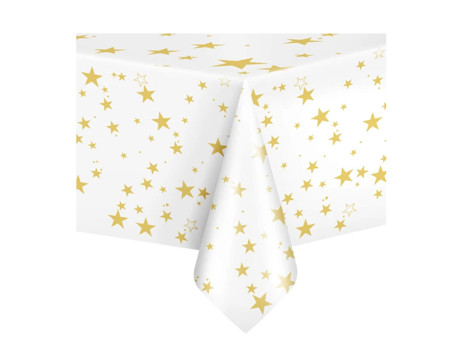 Obrus urodzinowy biały w złote gwiazdki - 137 x 274 cm - 1 szt.