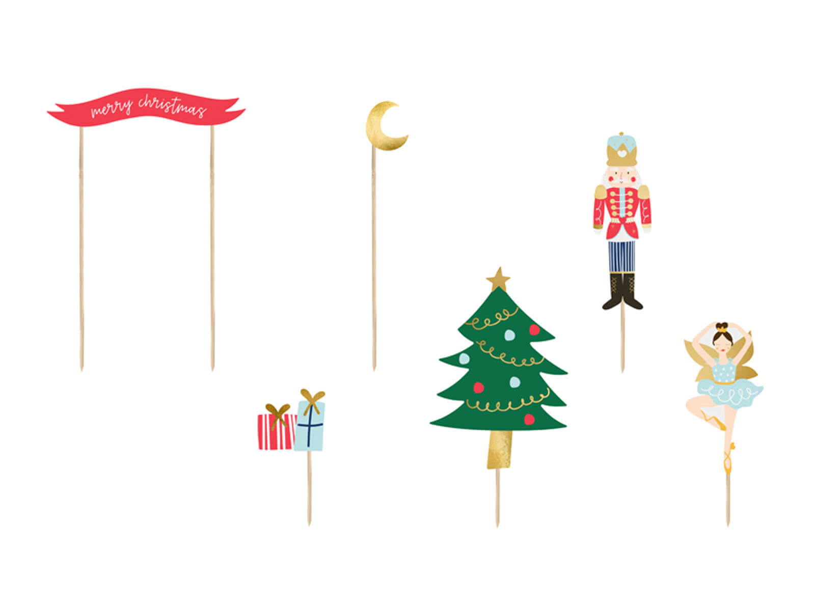 Przemień swoje świąteczne wypieki w małe dzieła sztuki z naszym zestawem topperów świątecznych "Dziadek do orzechów". Zestaw zawiera sześć różnych, kolorowych dekoracji, które dodadzą magii każdemu deserowi. W skład zestawu wchodzą topper w kształcie dziadka do orzechów, baletnicy, choinki, prezentów, księżyca oraz elegancki topper z napisem Merry Christmas.