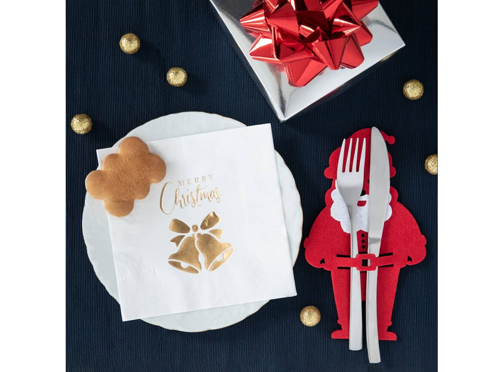 Przygotuj swój stół na świąteczne przyjęcia z eleganckim dodatkiem w postaci białych, papierowych serwetek z oryginalnym złotym motywem dzwonków i napisem Merry Christmas. Każda z serwetek ma wymiary 33 cm x 33 cm po rozłożeniu, co czyni je nie tylko praktycznym, ale i dekoracyjnym elementem na twoim stole.