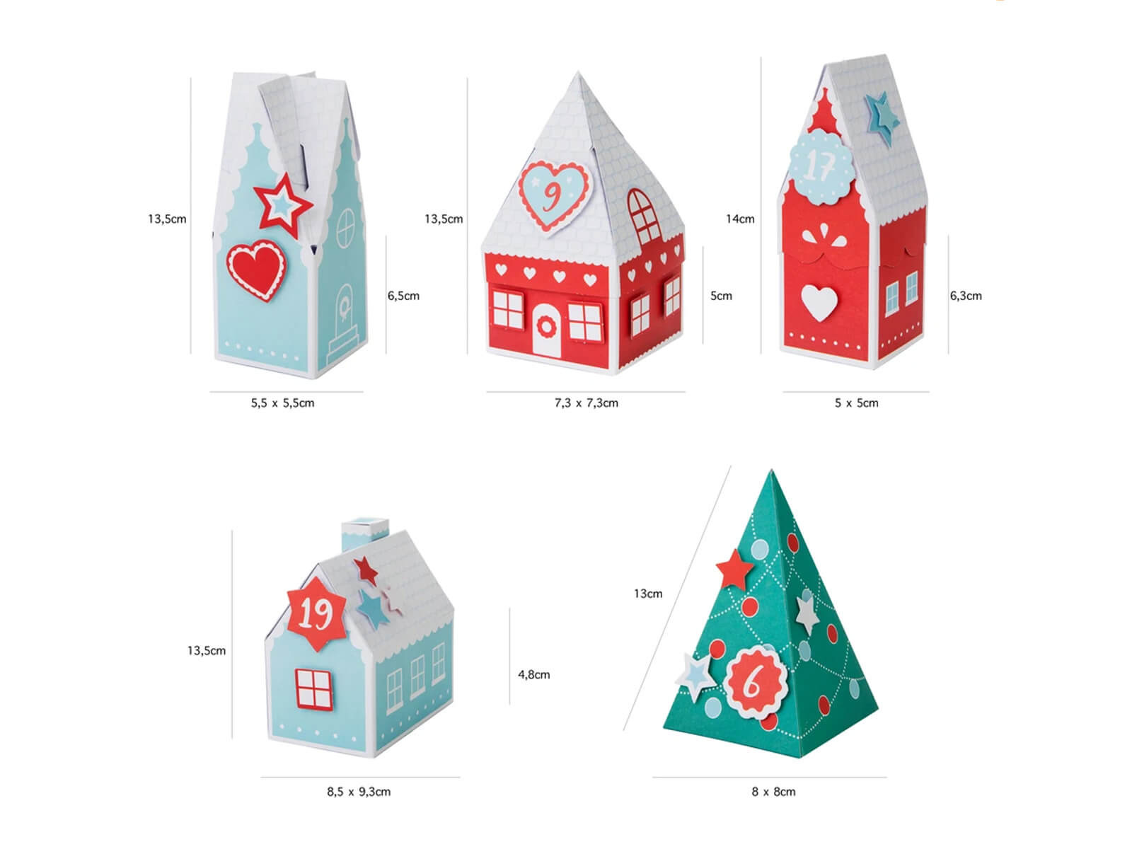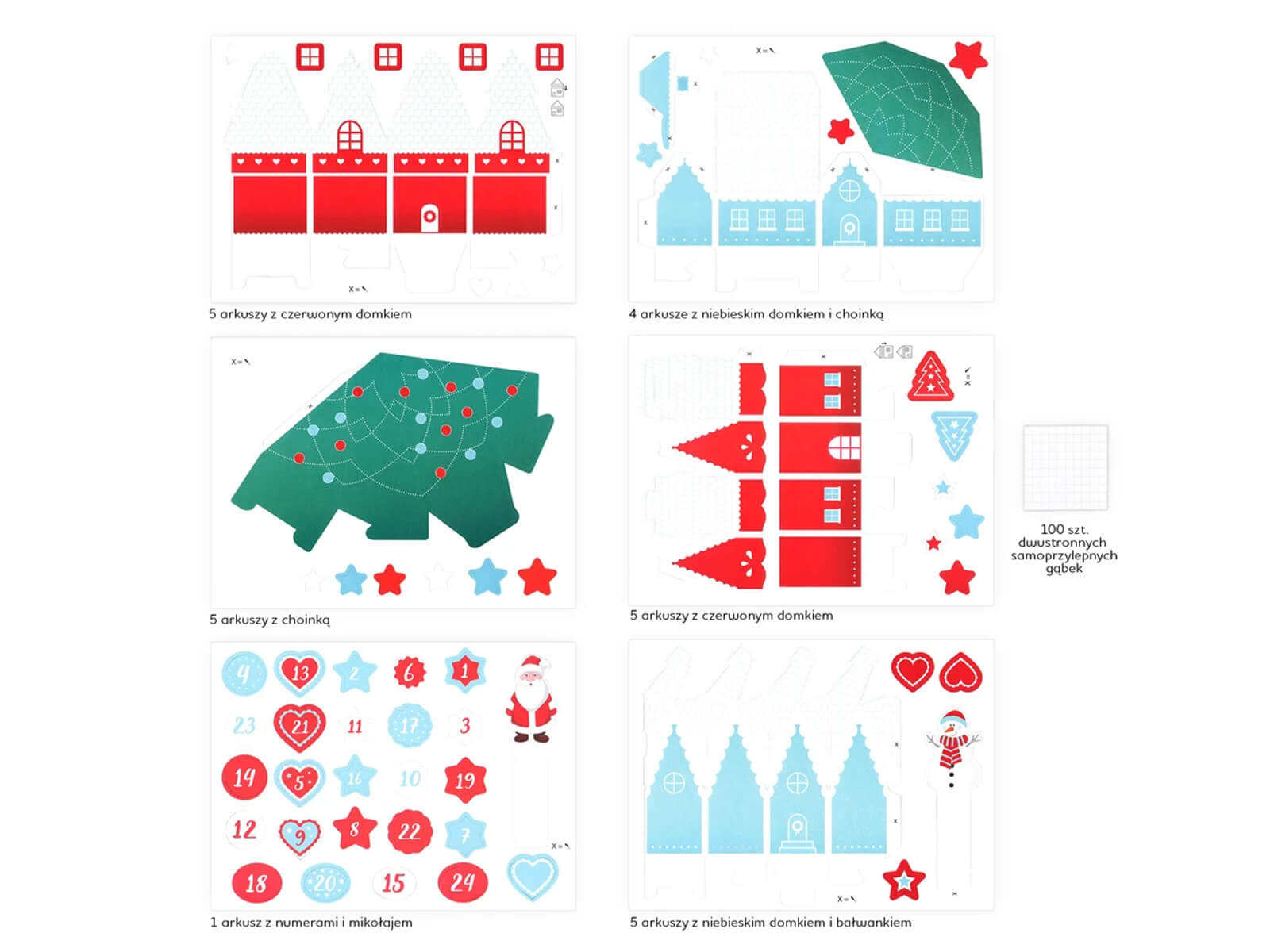 Zawiera arkusz z numerkami, dzięki czemu każdy domek może być wykorzystany jako kolejny dzień odliczania do Wigilii. Ten kalendarz adwentowy to doskonała alternatywa dla tradycyjnych słodyczy, oferując możliwość personalizacji prezentów ukrytych w domkach.