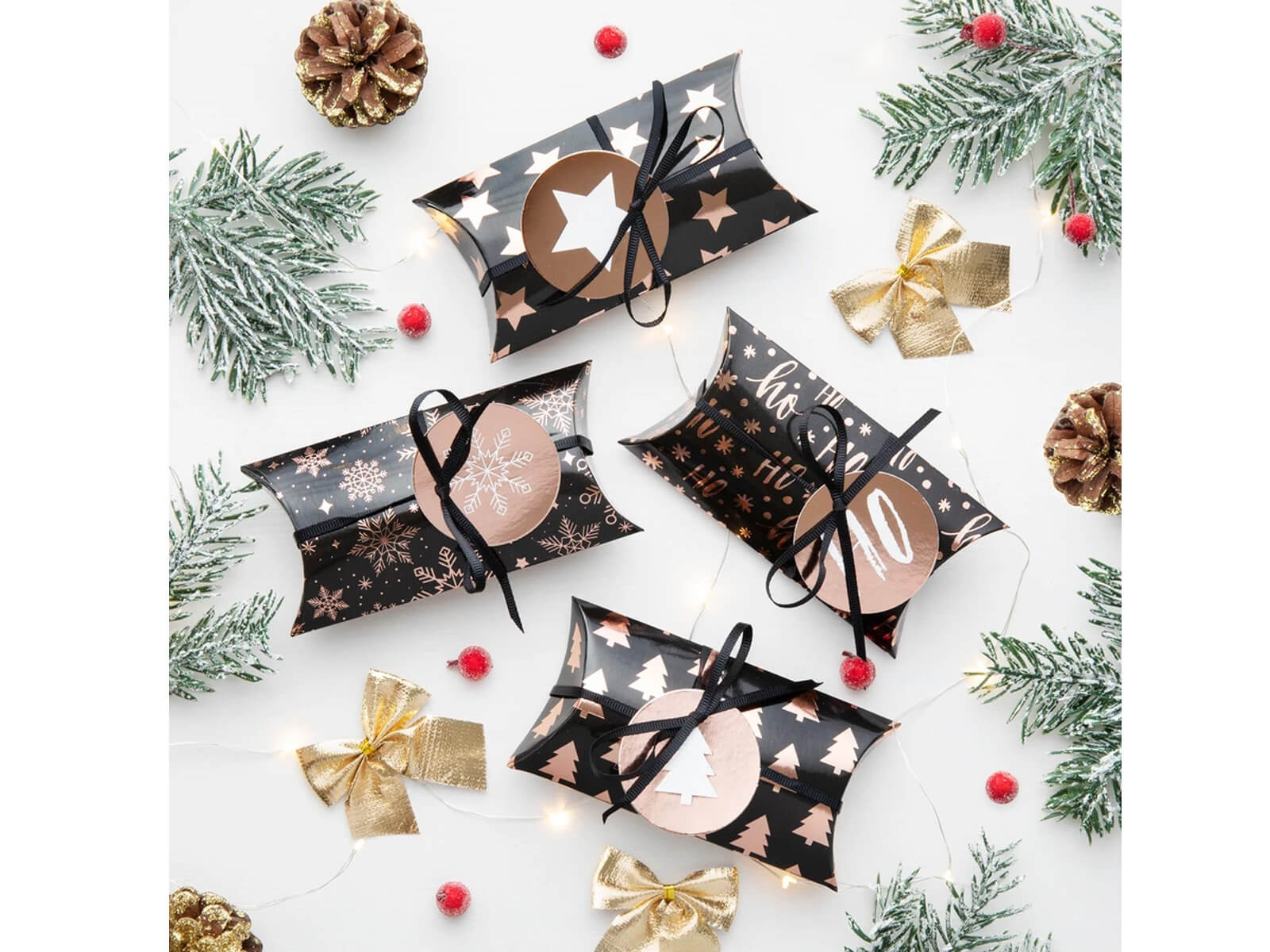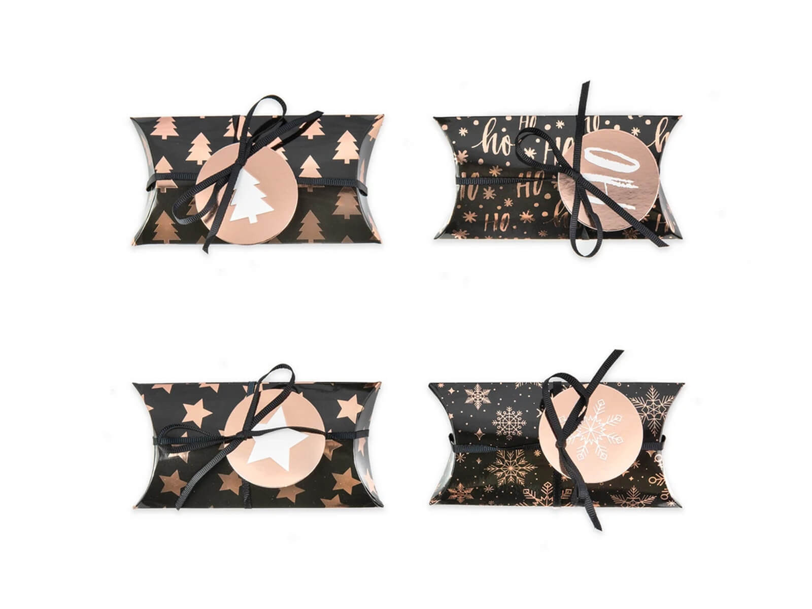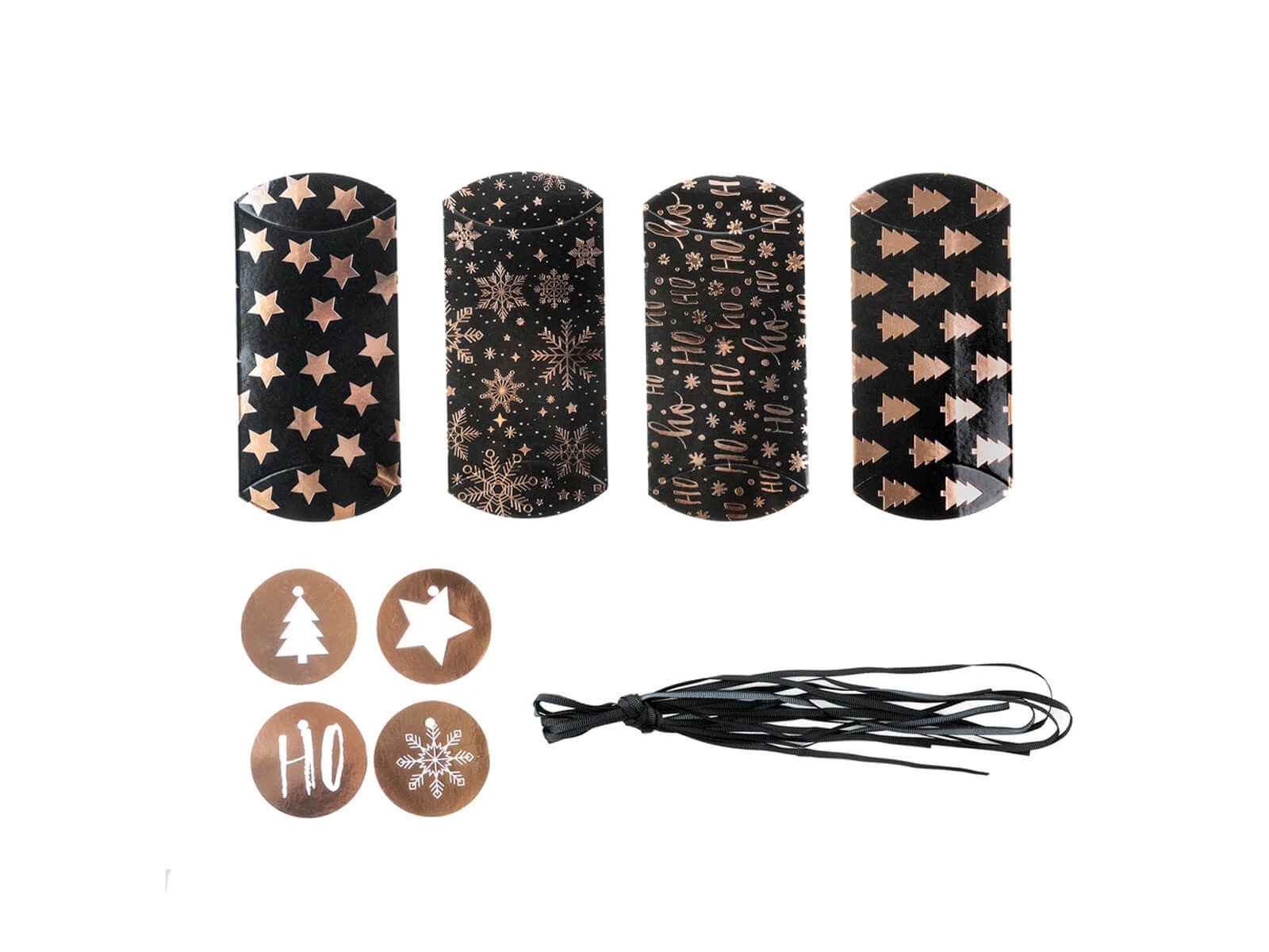 Te eleganckie papierowe pudełka prezentowe są idealnym wyborem, by podkreślić wyjątkowość Twojego podarunku. Wykonane z wysokiej jakości materiału w kolorze głębokiej czerni z subtelnym, różowo-złotym nadrukiem dodają klasy każdemu prezentowi. Komplet zawiera cztery pudełka wraz z praktycznymi akcesoriami, które ułatwią ich personalizację i dekorację.