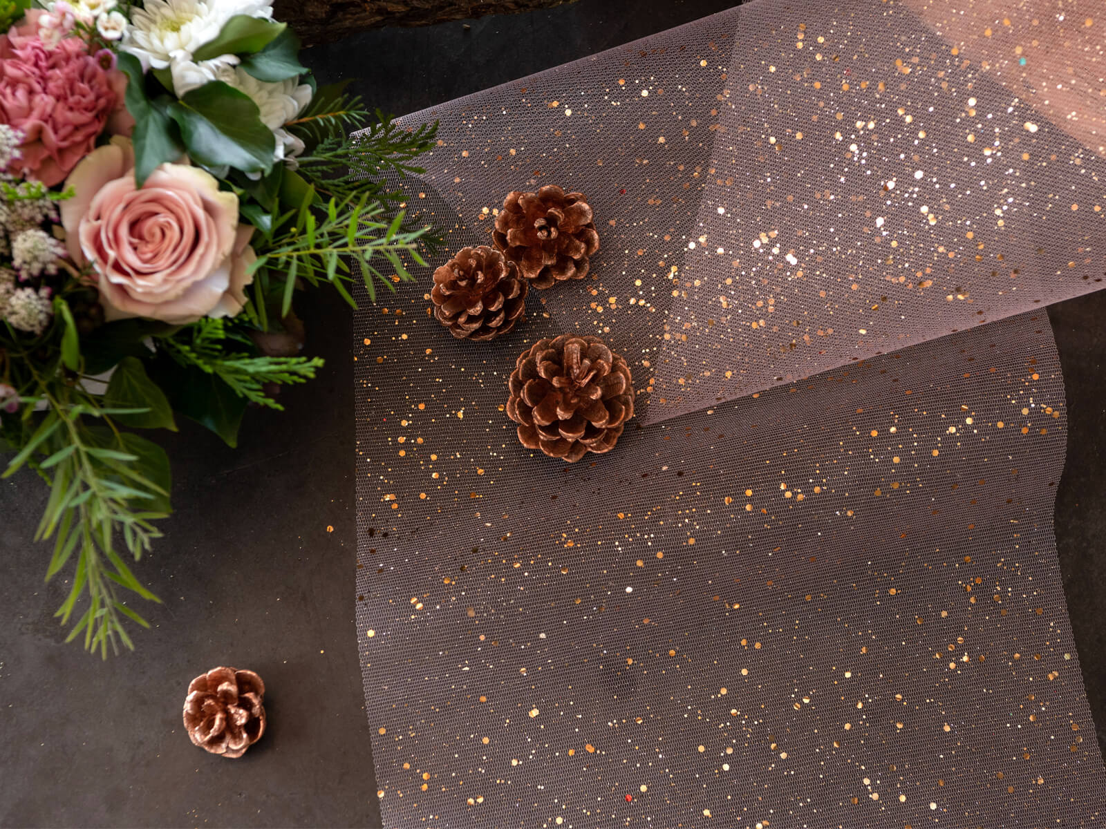 Zadbaj o elegancję swojego stołu z naszym luksusowym bieżnikiem brokatowym w kolorze różowego złota!