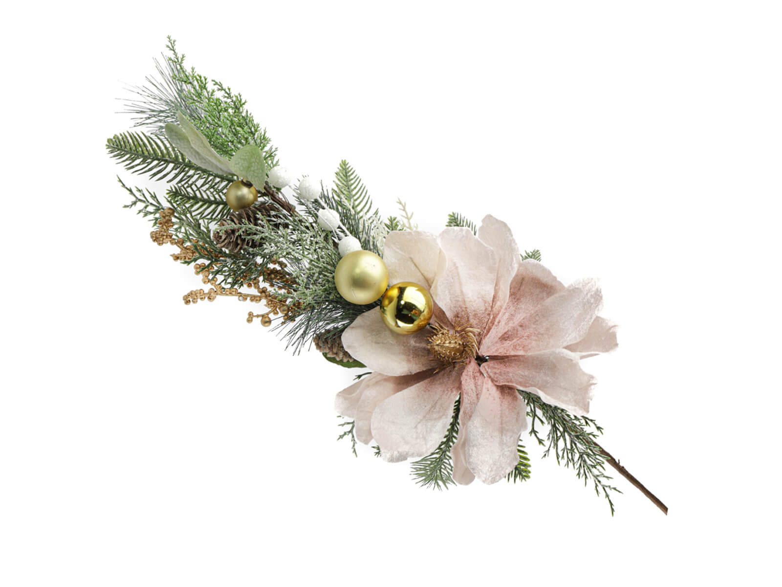 Odkryj magię Świąt Bożego Narodzenia z naszą wyjątkową dekoracją w postaci gałązki ozdobnej. Ta piękna kompozycja, o długości 70 cm, składa się ze świerkowych gałązek, delikatnych listków, naturalnej szyszki, złotych bombek oraz bladoróżowego kwiatka, co dodaje jej subtelnego uroku. Idealnie komponuje się z każdą świąteczną aranżacją, wprowadzając do domu ciepłą, świąteczną atmosferę.