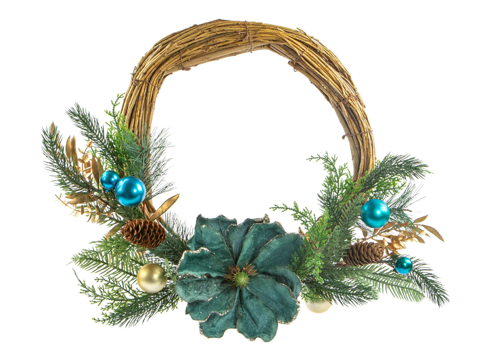 W skład dekoracji wchodzą naturalnie wyglądające gałązki świerku, ozdobione złotymi listkami, naturalnymi szyszkami, a także turkusowymi i złotymi bombkami. Całość uzupełnia elegancki, ciemnozielony kwiatek, który dodaje wieńcowi wyjątkowej głębi. Ten świąteczny wieniec może być efektownym dodatkiem zarówno na drzwi wejściowe, jak i ścianę czy kominek.