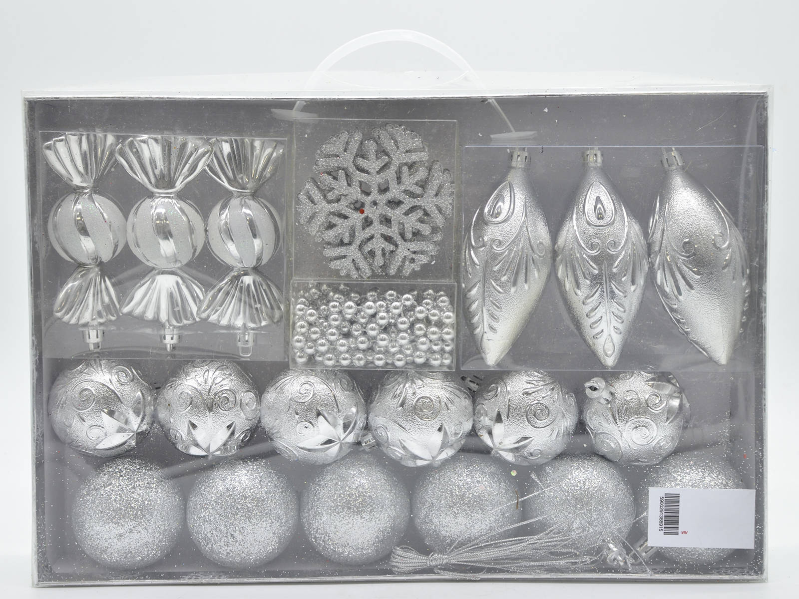 Zestaw 25 eleganckich dekoracji choinkowych w kolorze srebrnym doda blasku i stylu każdemu wnętrzu podczas świątecznych celebracji. Wykonane z wysokiej jakości plastiku, te ozdoby są zarówno trwałe, jak i piękne, idealnie komponując się z każdym stylem dekoracji świątecznej.
