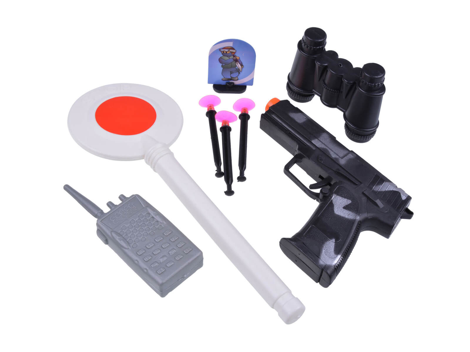 Pozwól swoim dzieciom wziąć sprawiedliwość w swoje ręce dzięki temu niesamowitemu zestawowi policyjnemu! Ten doskonały dodatek do kostiumu zawiera policyjny lizak, pistolet, lotki z przyssawkami, małą tarczę strzelniczą, imitację krótkofalówki i lornetkę. Wszystko, czego potrzebują, aby w pełni udawać policjanta w zaciszu własnego domu!