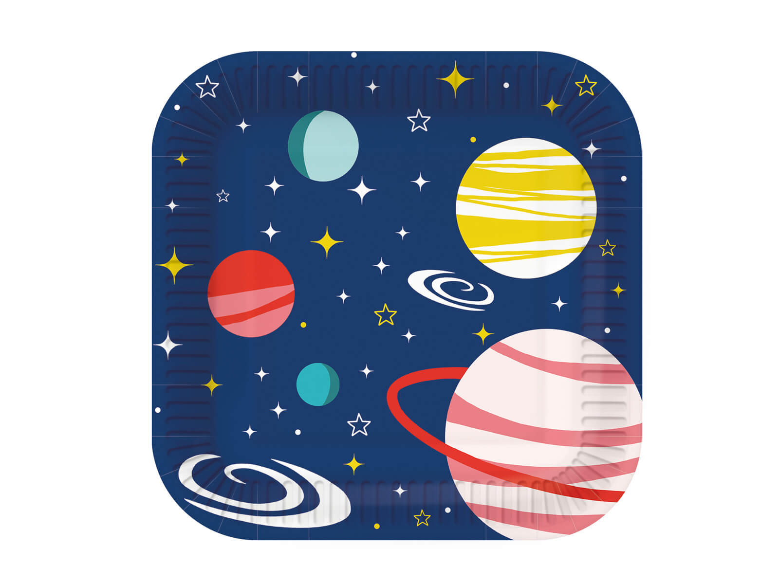 Kwadratowe talerzyki papierowe Kosmos o wymiarach 23 cm x 23 cm to idealne rozwiązanie na urodzinowy stół dla małych fanów nauki, kosmonautyki i fantastycznych przygód. W opakowaniu znajdziesz 10 sztuk – wystarczającą ilość na przyjęcie dla wszystkich zaproszonych przyjaciół.