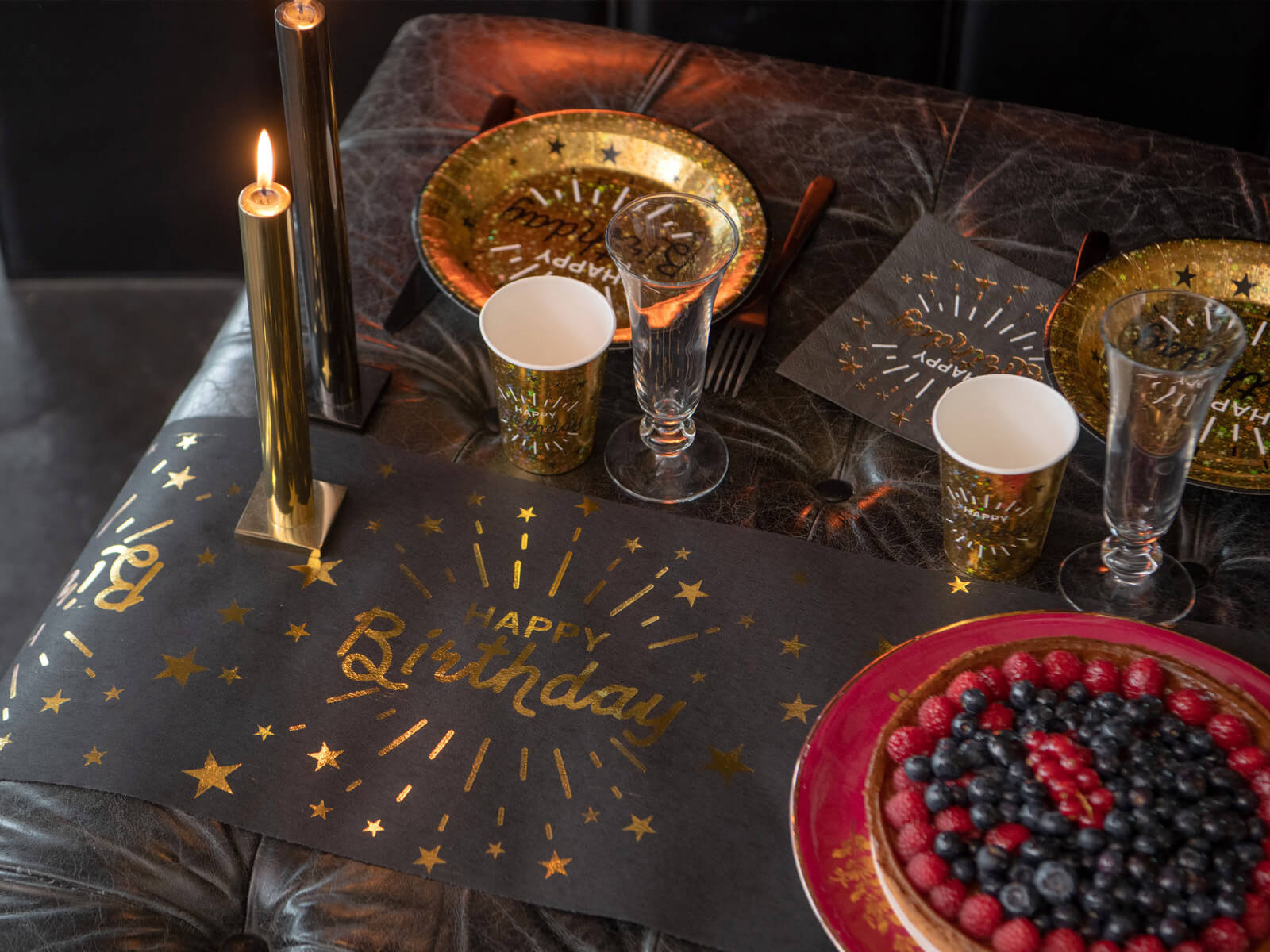 - Ekskluzywny design: Wyjątkowy kolor czarny ze złotym napisem Happy Birthday sprawi, że Twój stół będzie prezentował się niezwykle efektownie.