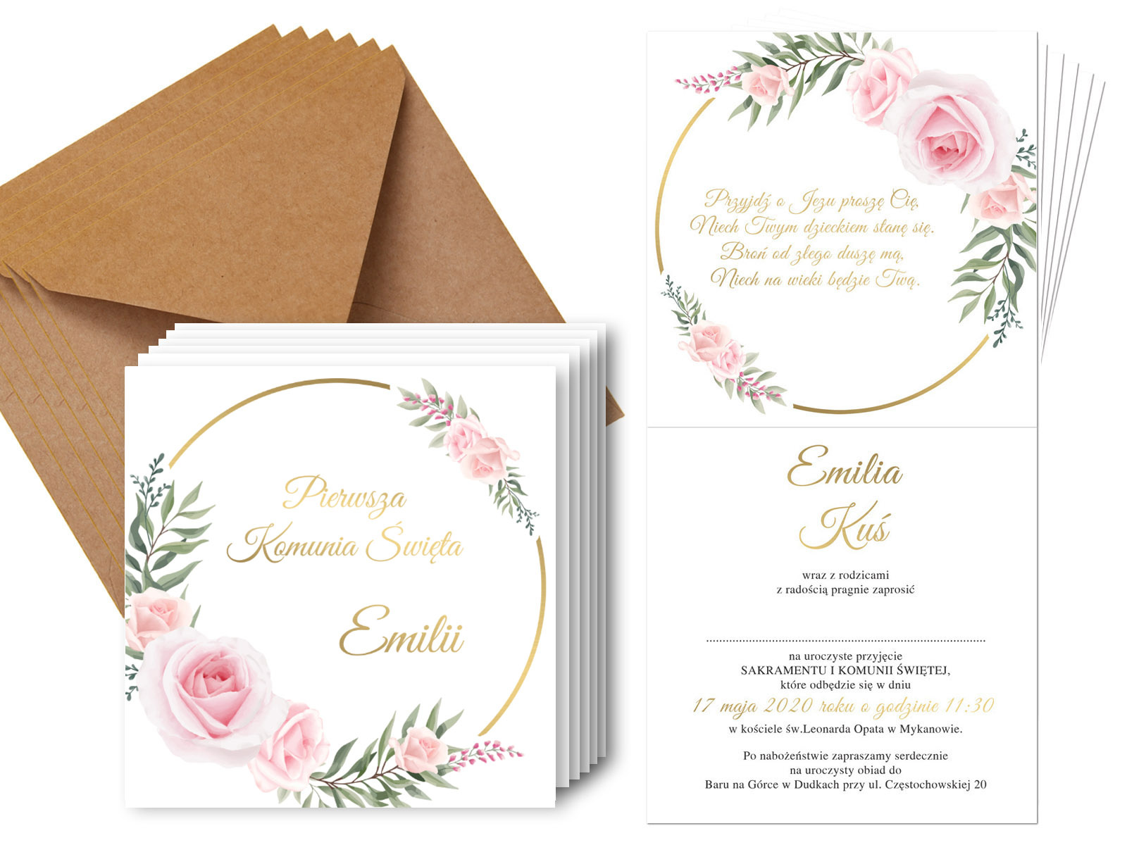 Szukasz idealnych zaproszeń na pierwszą komunię? Nie szukaj dalej! Nasze spersonalizowane zaproszenia to doskonały sposób, aby uczynić wyjątkowy dzień Twojego dziecka jeszcze bardziej niezapomnianym. Te misternie zaprojektowane karty zawierają motyw kwiatowy z odrobiną koloru różowego, dzięki czemu są zarówno piękne, jak i wyjątkowe. Każdy zestaw zawiera 6 kopert typu kraft dla większej wygody. Wymiary to 14x14 cm (14x28). To doskonały sposób na uczczenie tego szczególnego wydarzenia! Zaproś przyjaciół i rodzinę w wielkim stylu i upewnij się, że twoja ukochana osoba poczuje się wyjątkowo w dniu swojej Pierwszej Komunii Świętej.