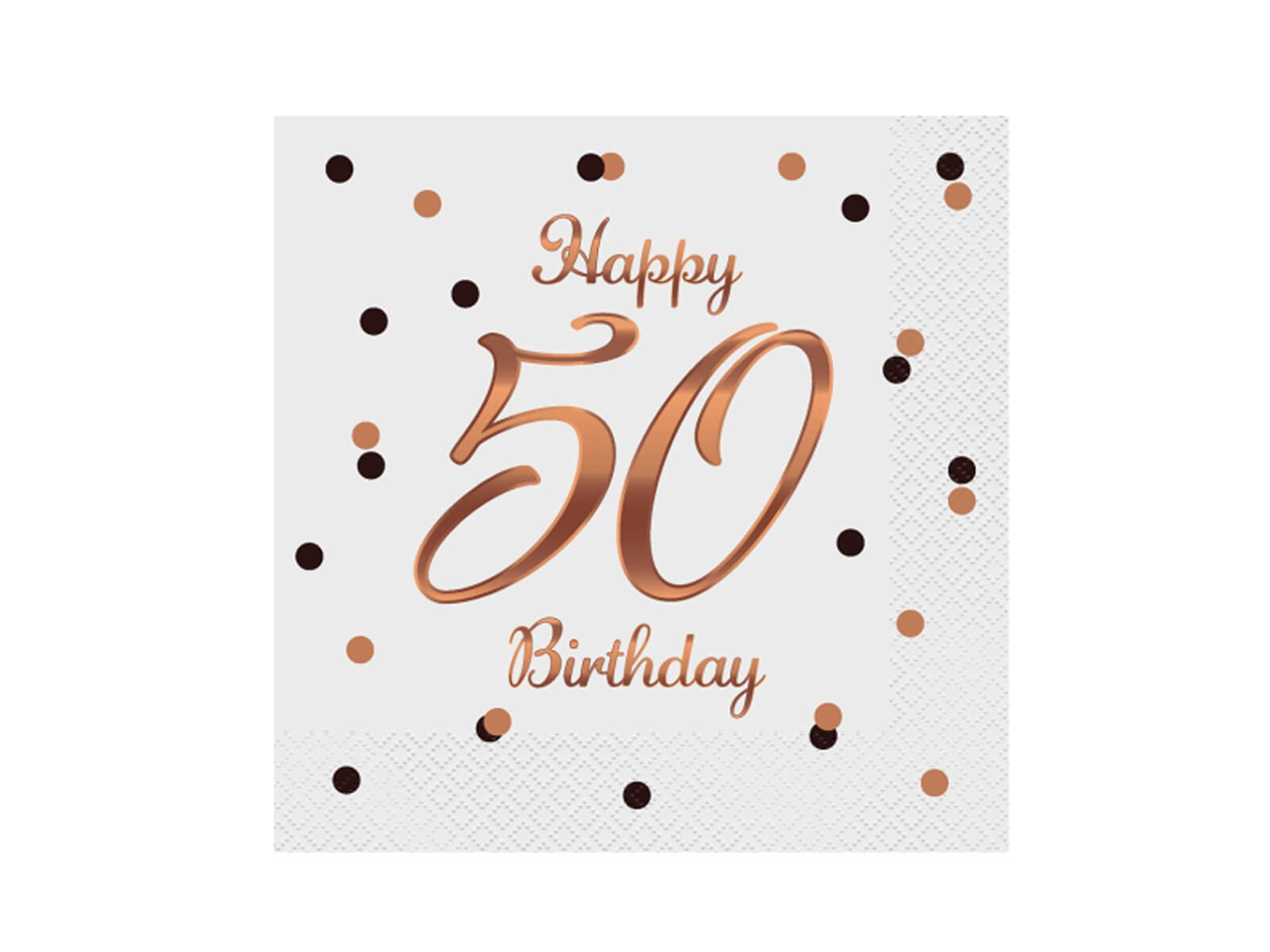 Użyj tych modnych i stylowych serwetek Happy 50 Birthday, aby dodać odrobinę blasku i klasy do swojej pięćdziesiątej rocznicy urodzin! To specjalne opakowanie zawiera 20 sztuk luksusowych papierowych serwetek i wykończonych wspaniałym różowozłotym napisem, który natychmiast przeniesie wystrój Twojej imprezy na wyższy poziom. Te wyrafinowane serwetki po rozłożeniu mają wymiary 33 cm x 33 cm, dzięki czemu idealnie nadają się do nakrywania talerzy na ciasto lub inne pyszne smakołyki do herbaty. Zadbaj o to, by wszyscy Twoi bliscy czuli się wyjątkowo w dniu swoich sześćdziesiątych urodzin, wykorzystując te luksusowe i gustowne serwetki.