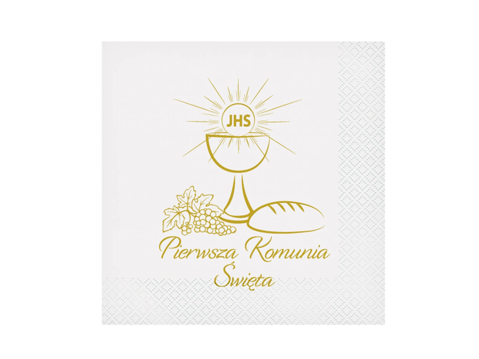 Serwetki ze złotym napisem Pierwsza Komunia Święta Kielich - 33 cm - 20 szt.