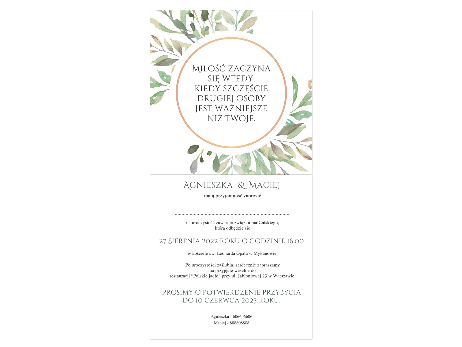 W uwagach do zamówienia należy podać imiona Państwa Młodych, datę i godzinę uroczystości, adres. Można edytować cały tekst na odwrocie zaproszenia.
