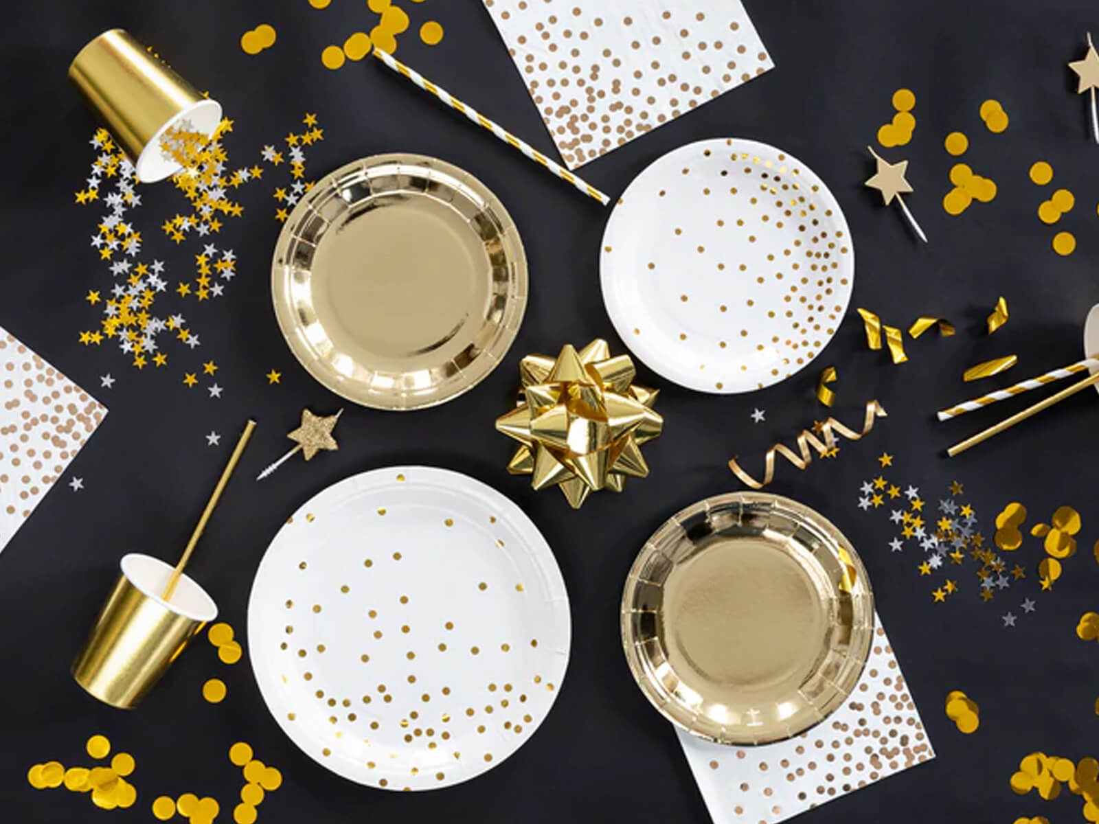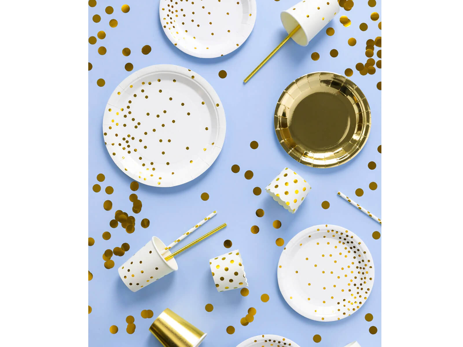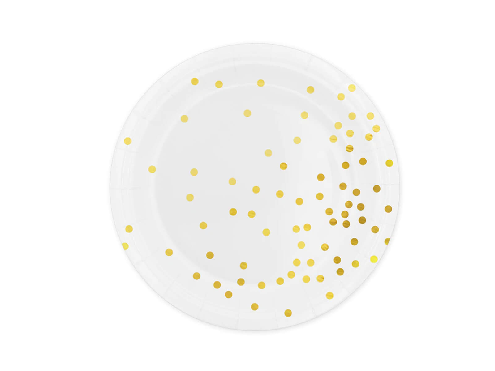 Talerzyki papierowe białe w złote groszki - 18 cm - 6 szt.