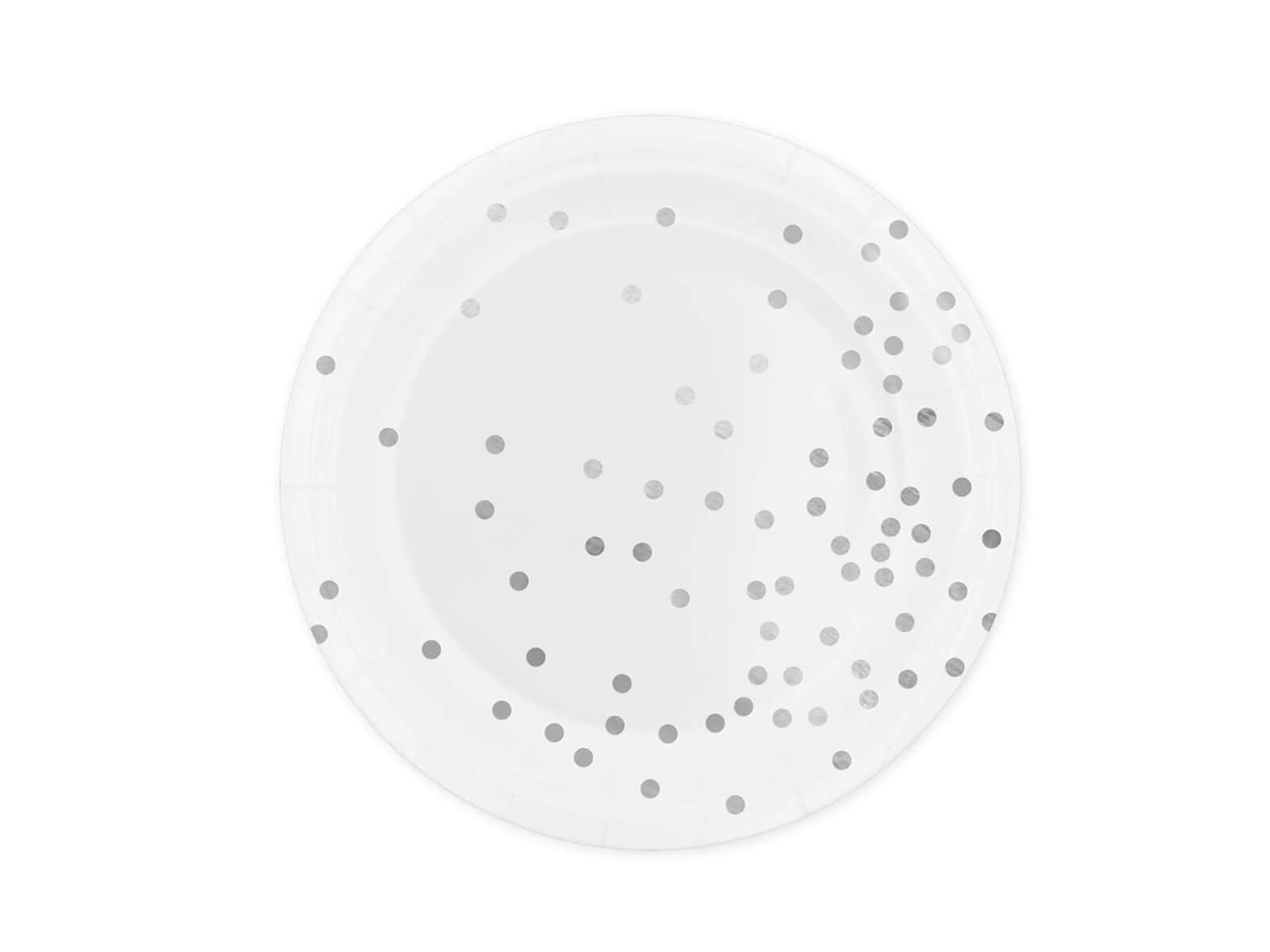 Talerzyki papierowe białe w srebrne groszki - 18 cm - 6 szt.