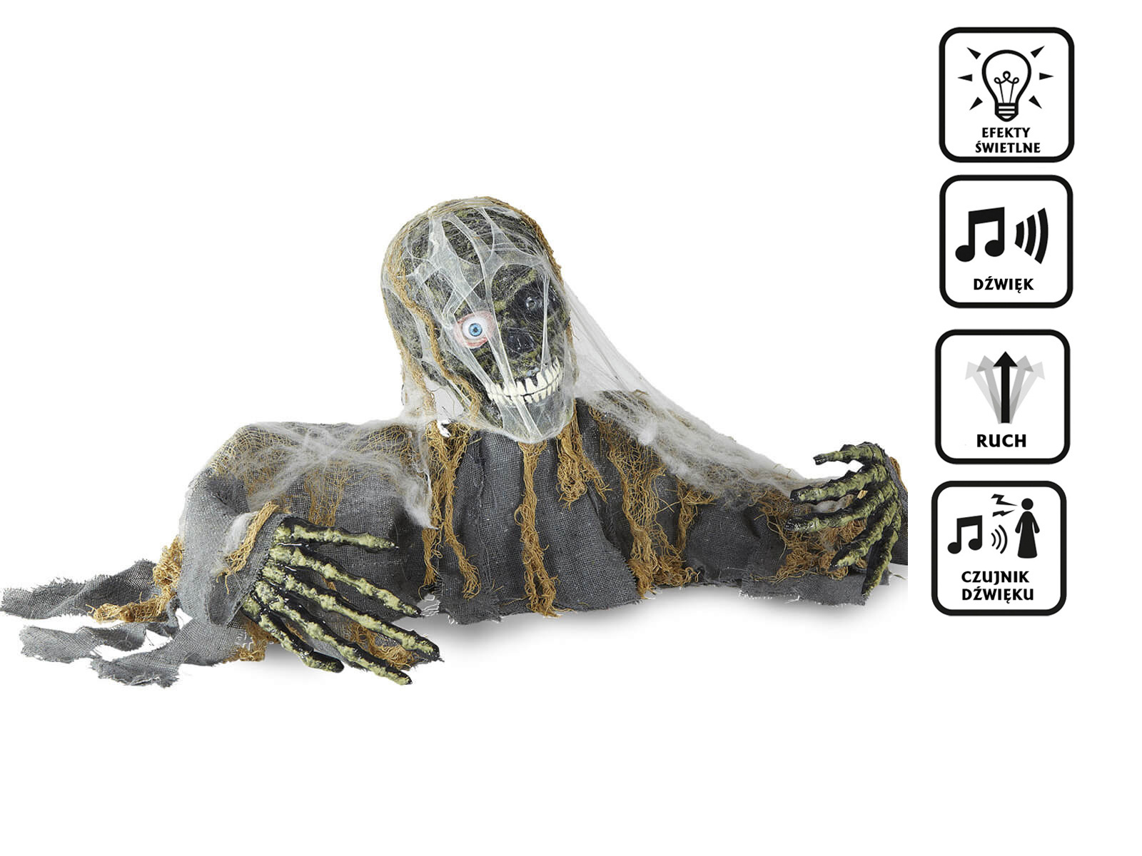 Posiada czujniki dźwięku, czyli np. po klaśnięciu głowa oraz ramiona dekoracji zaczynają się poruszać, uruchamiają się efekty dźwiękowe i świetlne.