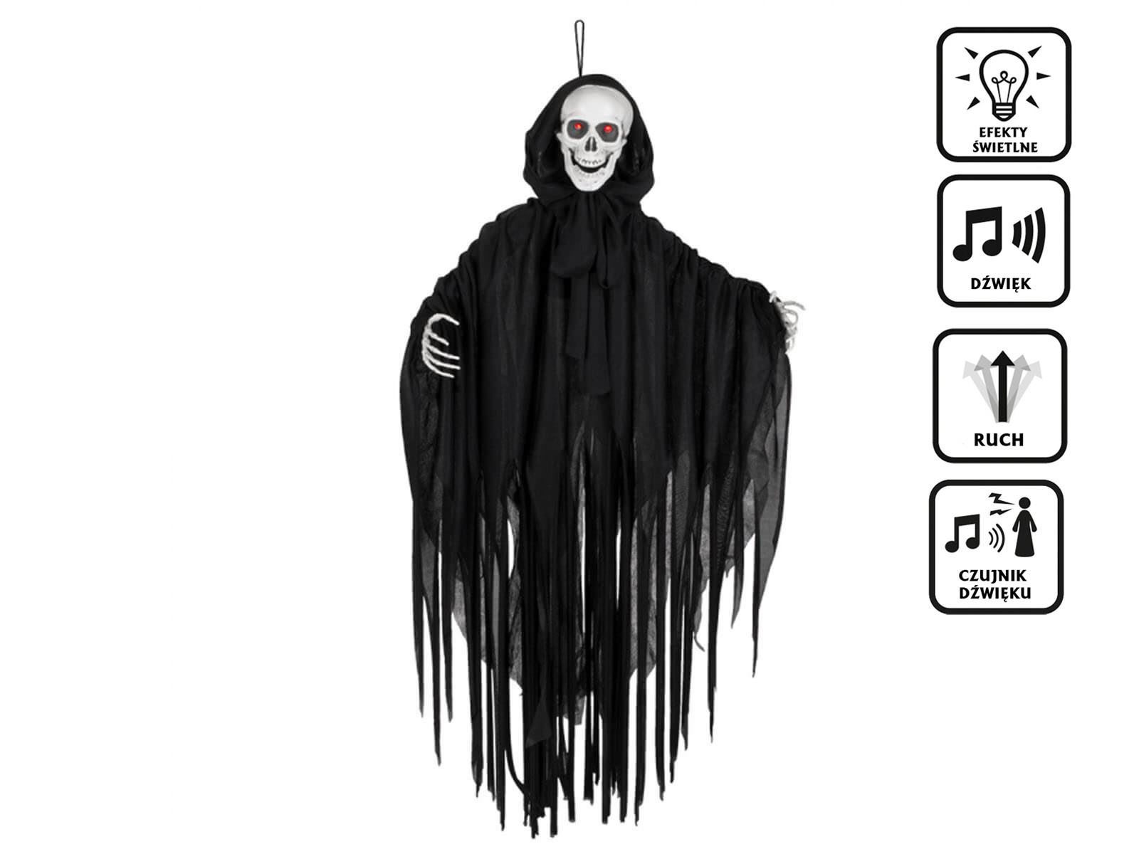 - Animowany Mroczny Żniwiarz świeci, porusza się i wydaje przerażające dźwięki.