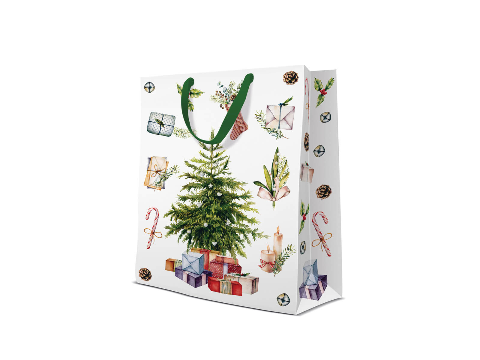 Ta elegancka torebka prezentowa jest idealnym rozwiązaniem na Boże Narodzenie. Wykonana z wysokiej jakości materiałów, charakteryzuje się pięknym białym kolorem oraz świątecznym nadrukiem choinki i prezentów, które dodają jej wyjątkowego charakteru.