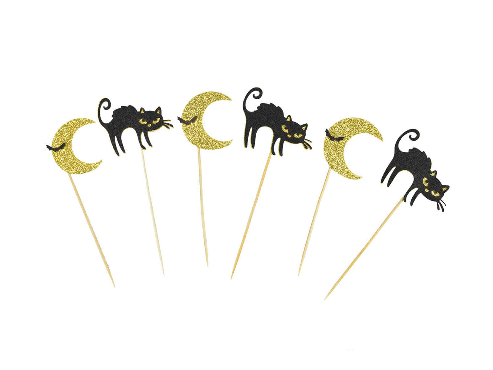Udekoruj swoje świąteczne wypieki w niezwykle uroczy sposób dzięki naszym pikerkom na babeczki "Czarne koty". Każdy piker przedstawia czarnego kota siedzącego na złotym księżycu, z dodatkiem małego, czarnego nietoperza, co dodaje całemu zestawowi halloweenowego charakteru. W zestawie znajduje się 6 sztuk o wysokości około 17 cm każda, idealnie nadają się na dekorację tortów, muffinek czy innych słodkości.