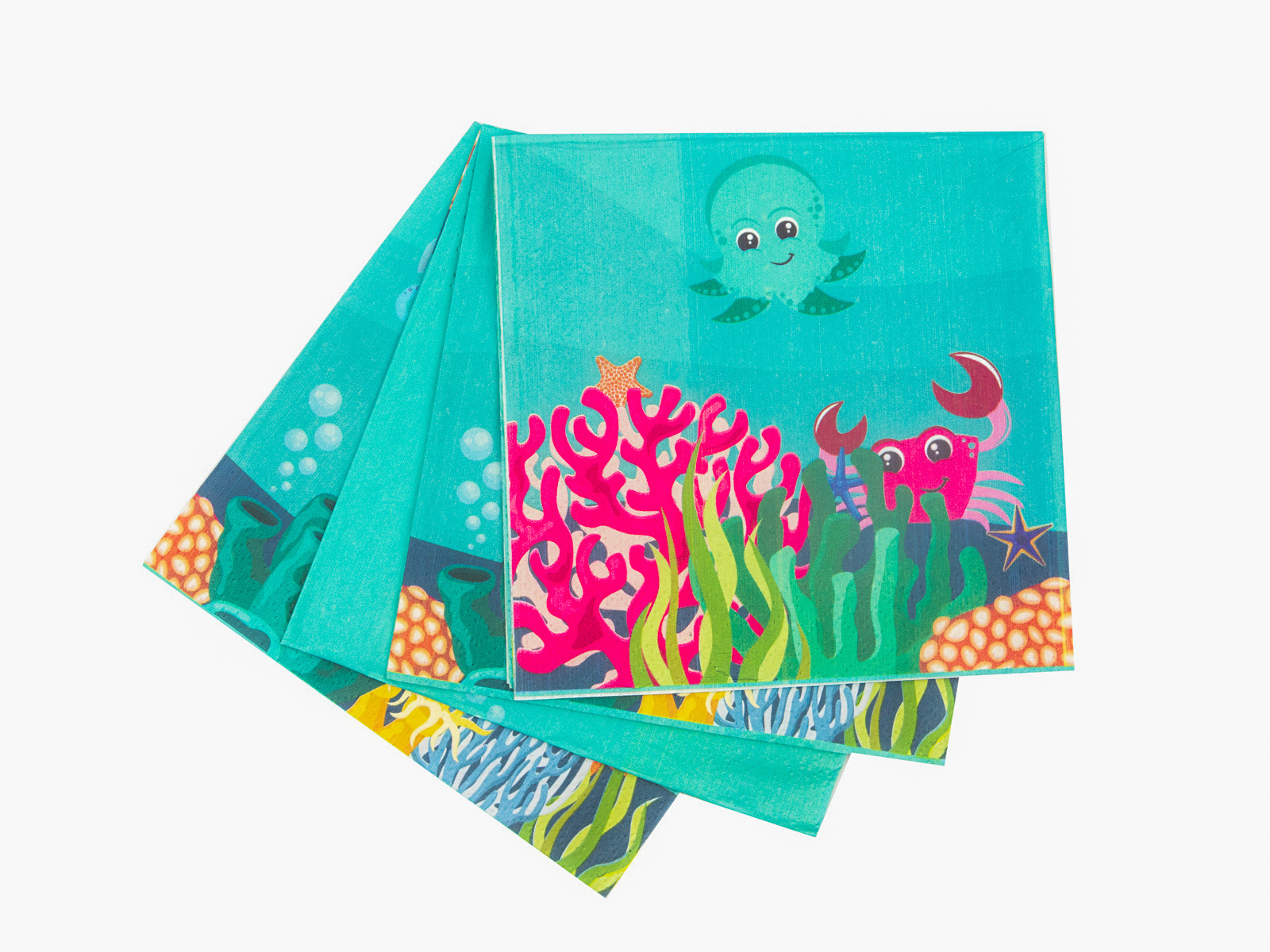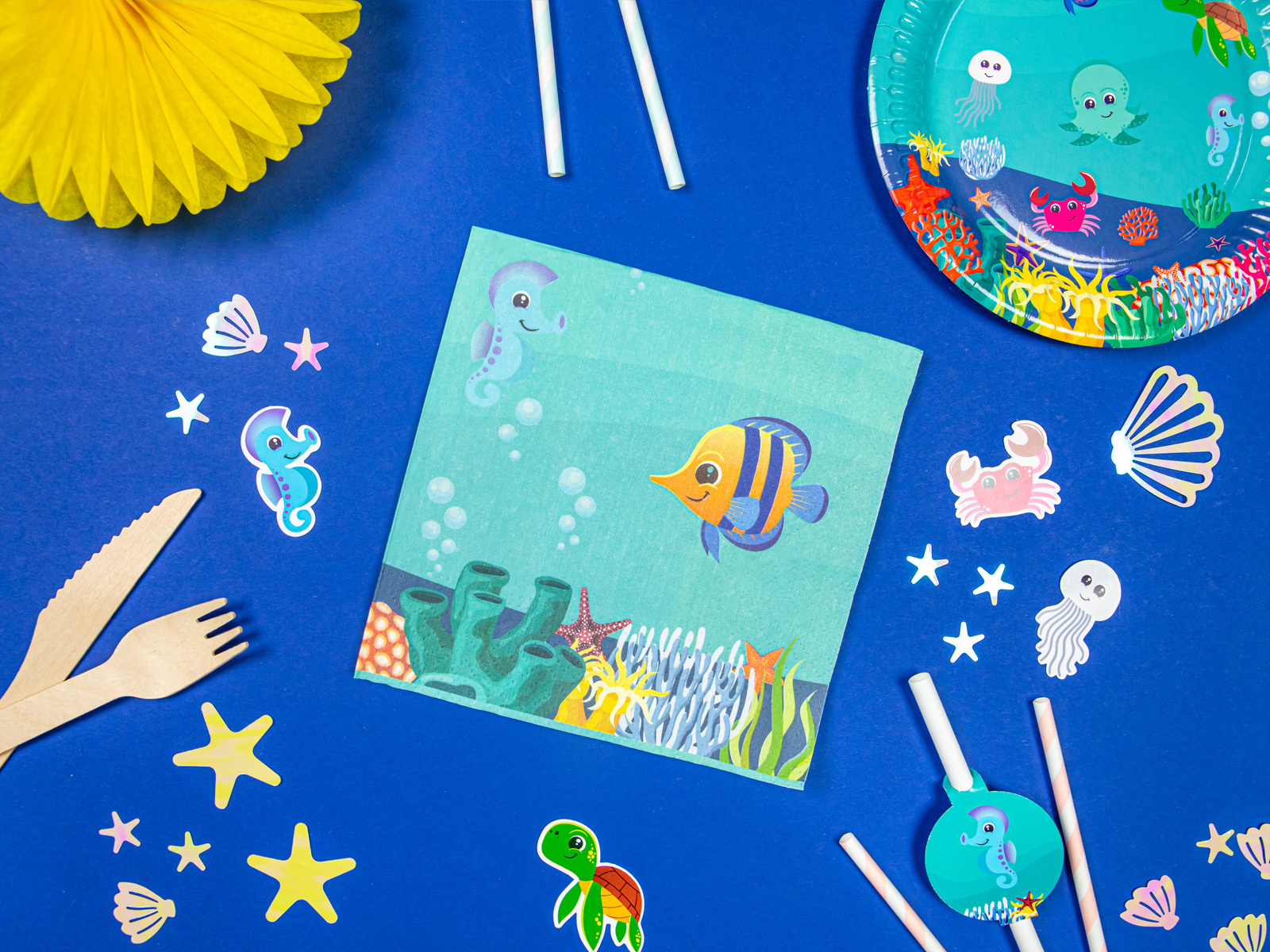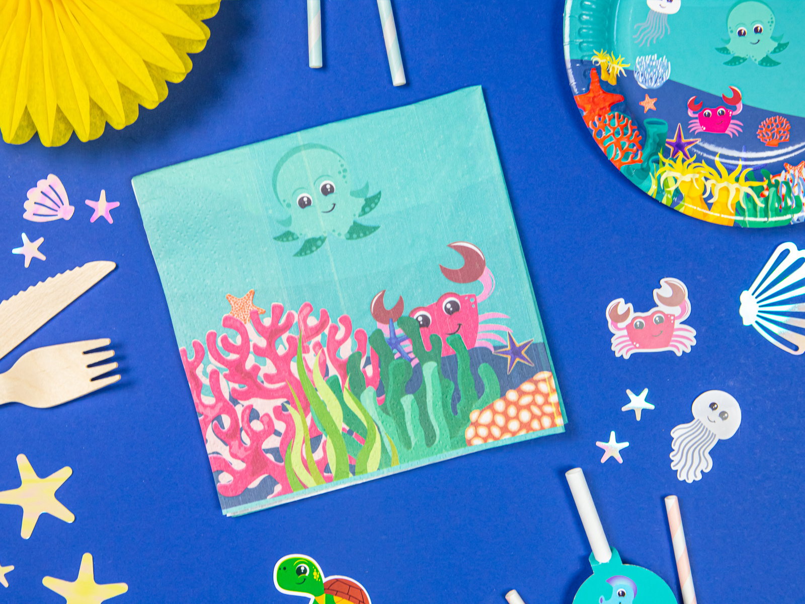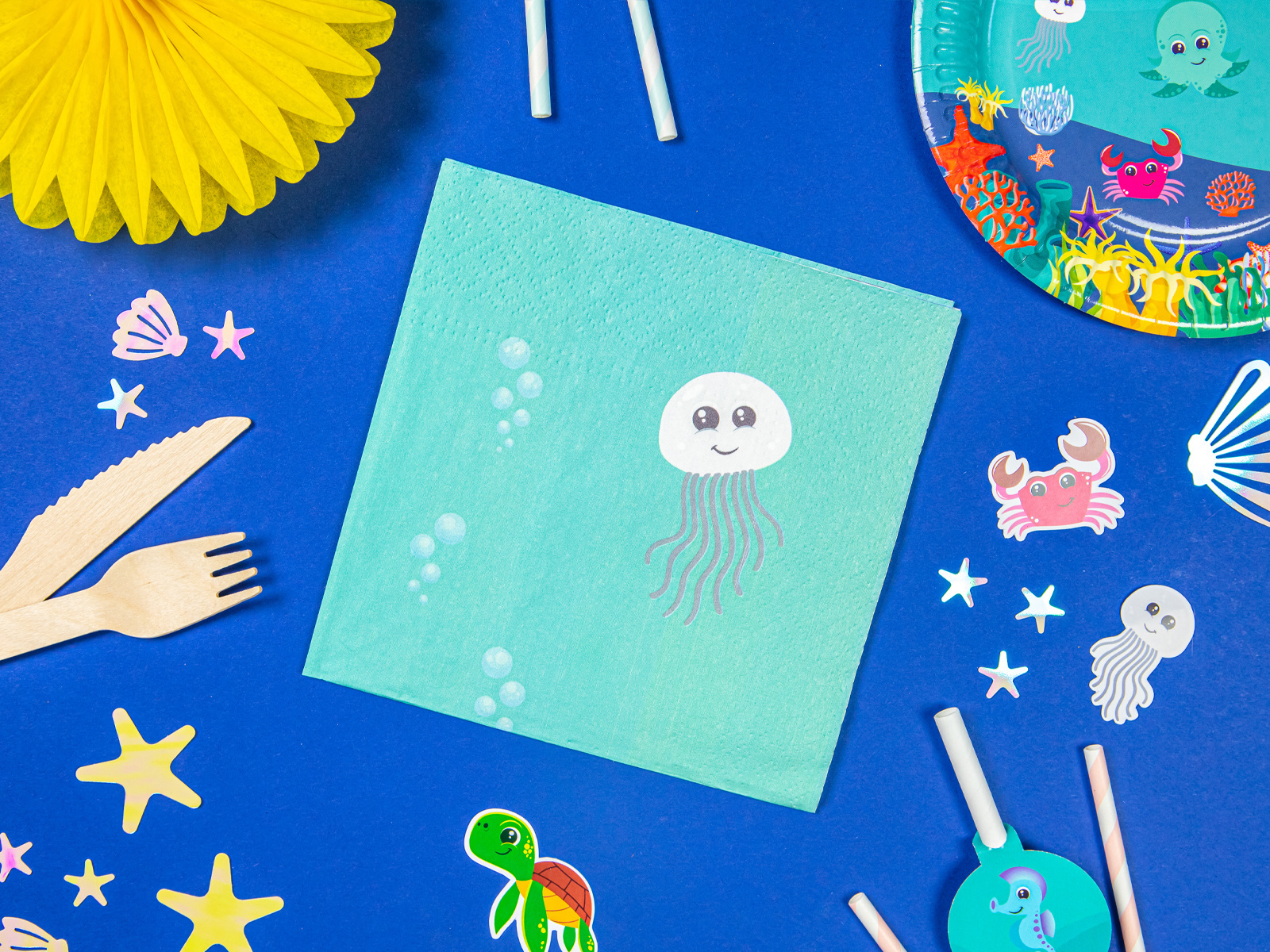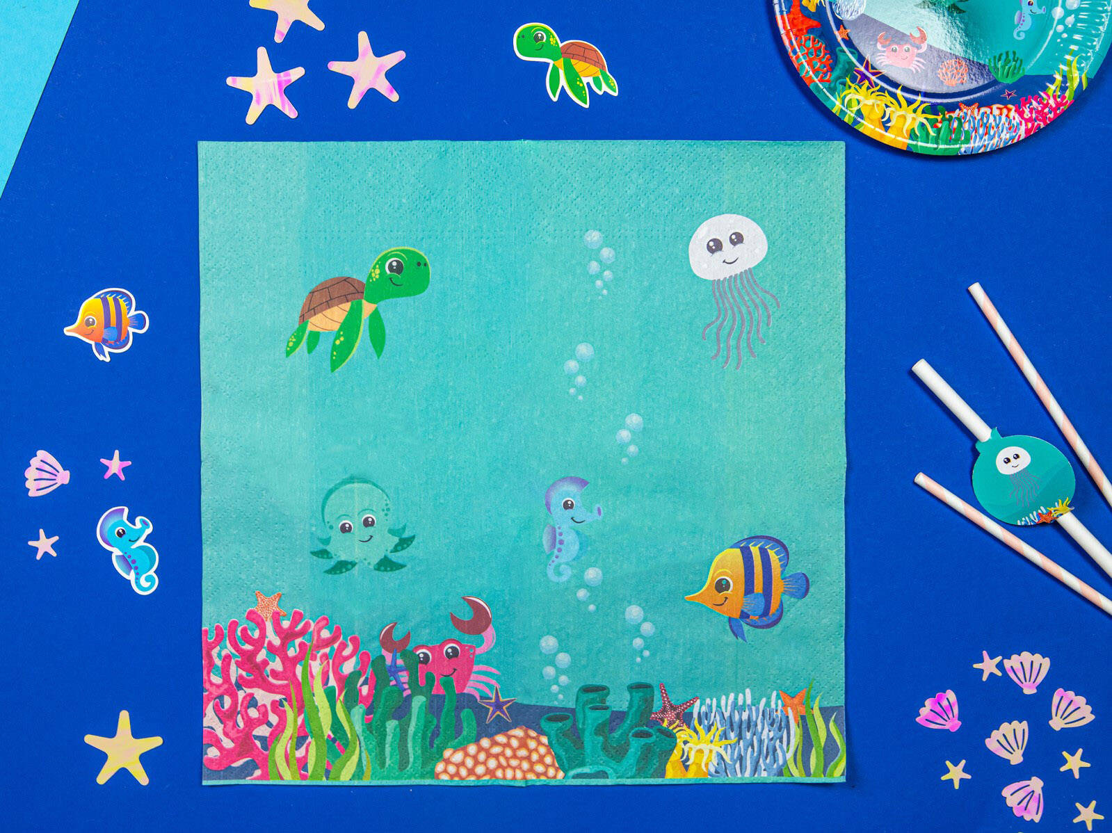 Przenieś swoje przyjęcie urodzinowe w niezwykłą, podwodną krainę dzięki naszym serwetkom z motywem Podwodnego Świata. Każda z 12 serwetek w zestawie jest wykonana z dwóch warstw wysokiej jakości papieru, co zapewnia ich wytrzymałość i absorpcyjność. Idealne na dziecięce urodziny, zarówno dla chłopców, jak i dziewczynek, a także tematyczne imprezy dla dorosłych. Z tą dekoracją każde przyjęcie stanie się bardziej kolorowe i radosne!